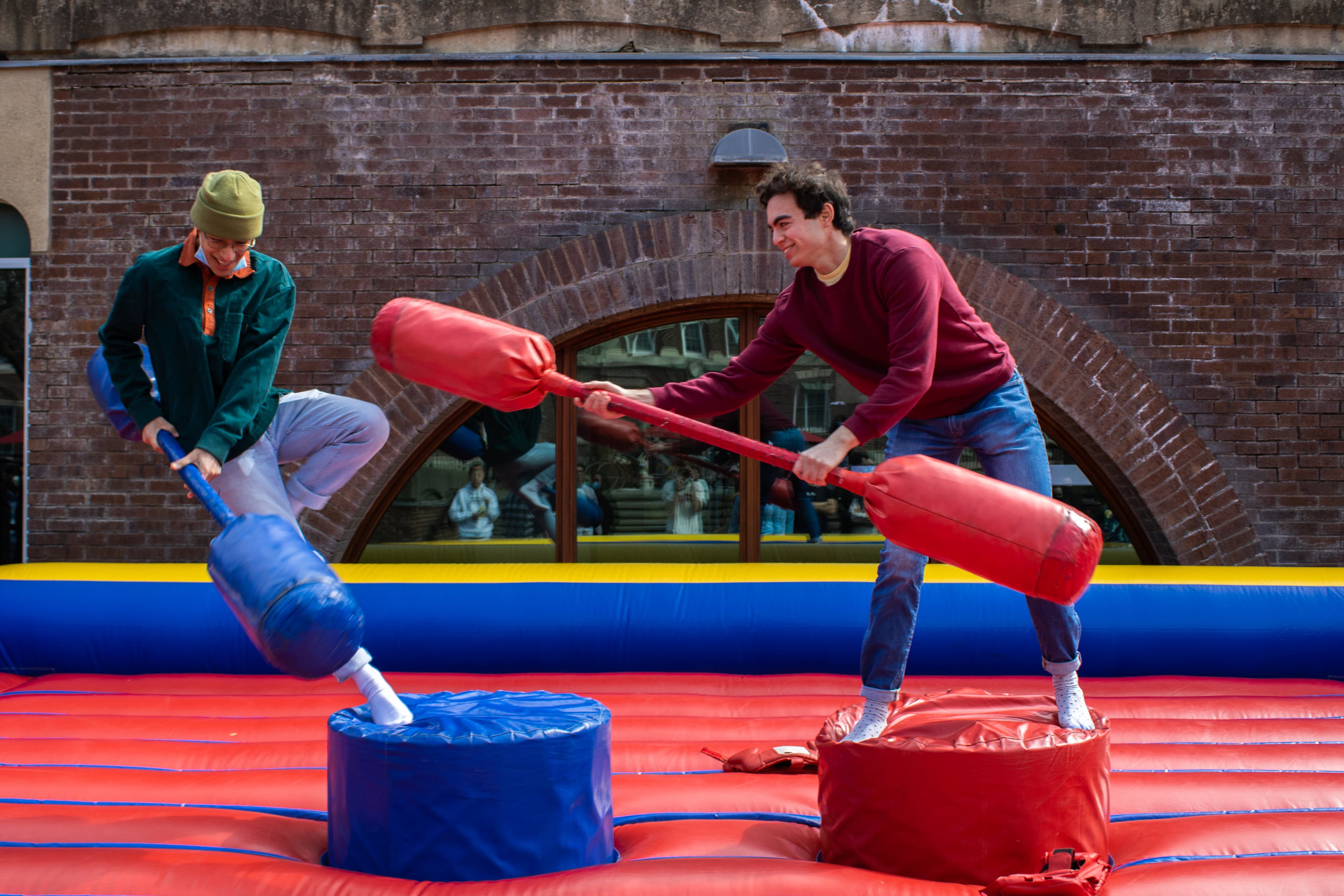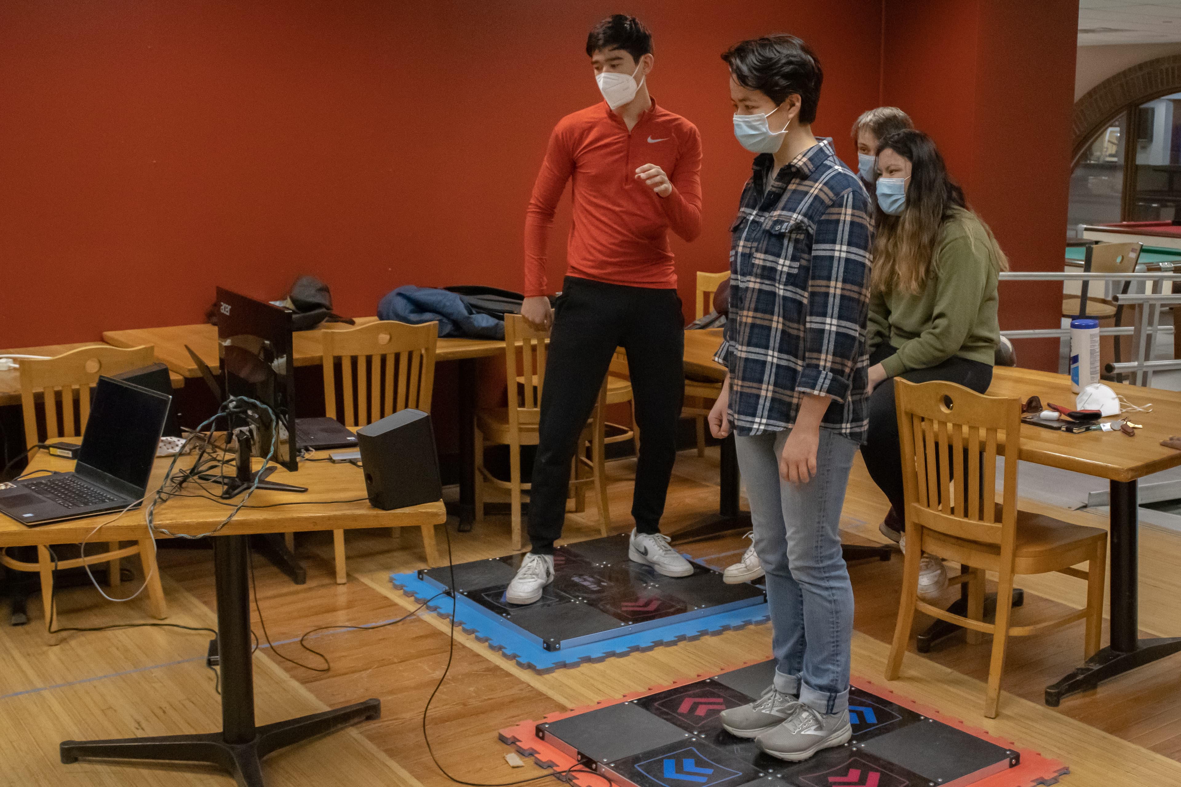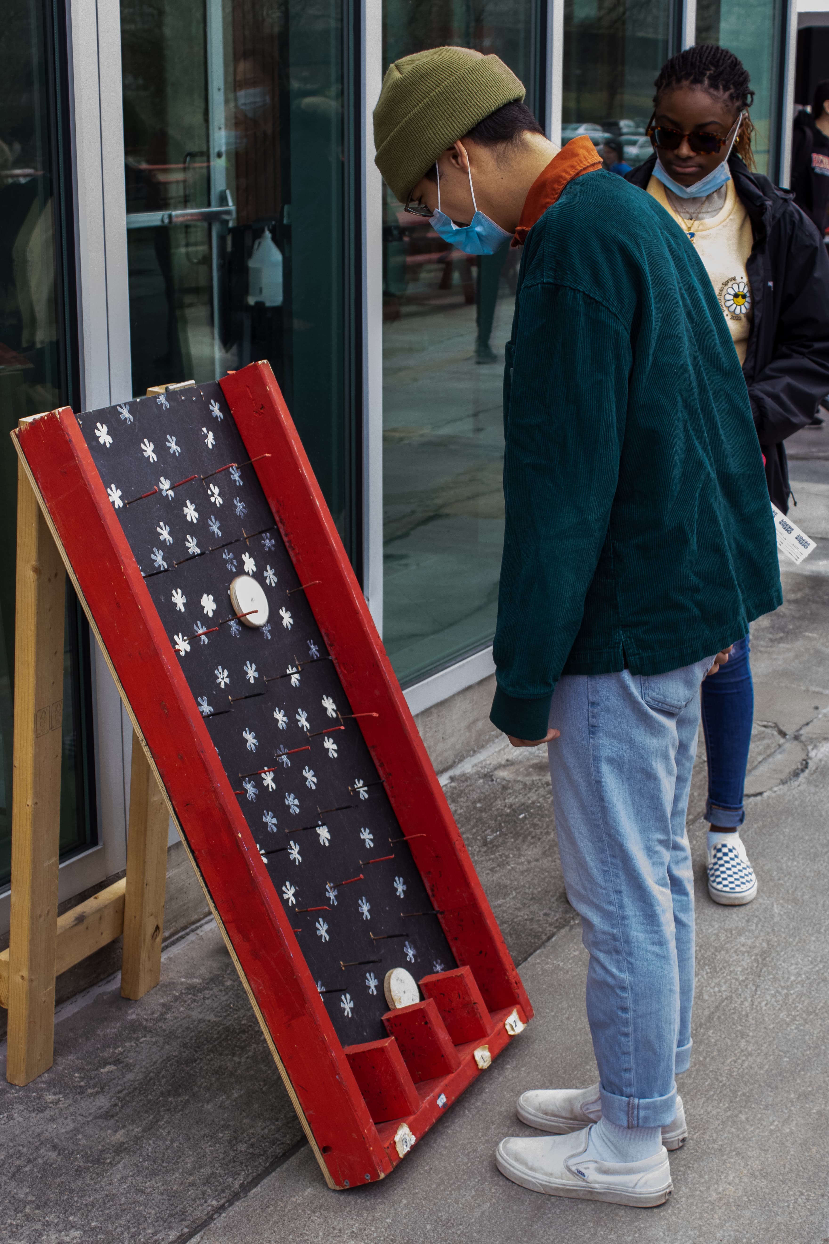 There were many other games at the carnival too, one of which was jousting (pictured left). This was a crowd favorite, with a long line for most of the day. Moreover, the Dance Dance Revolution Club hosted a DDR game for students to play (pictured middle). Students were able to choose almost any song to dance to and everyone had a blast playing. There also was a Plinko board game on the Union Patio (pictured right) which many students rushed to since it was an easy source of tickets for the prizes inside.