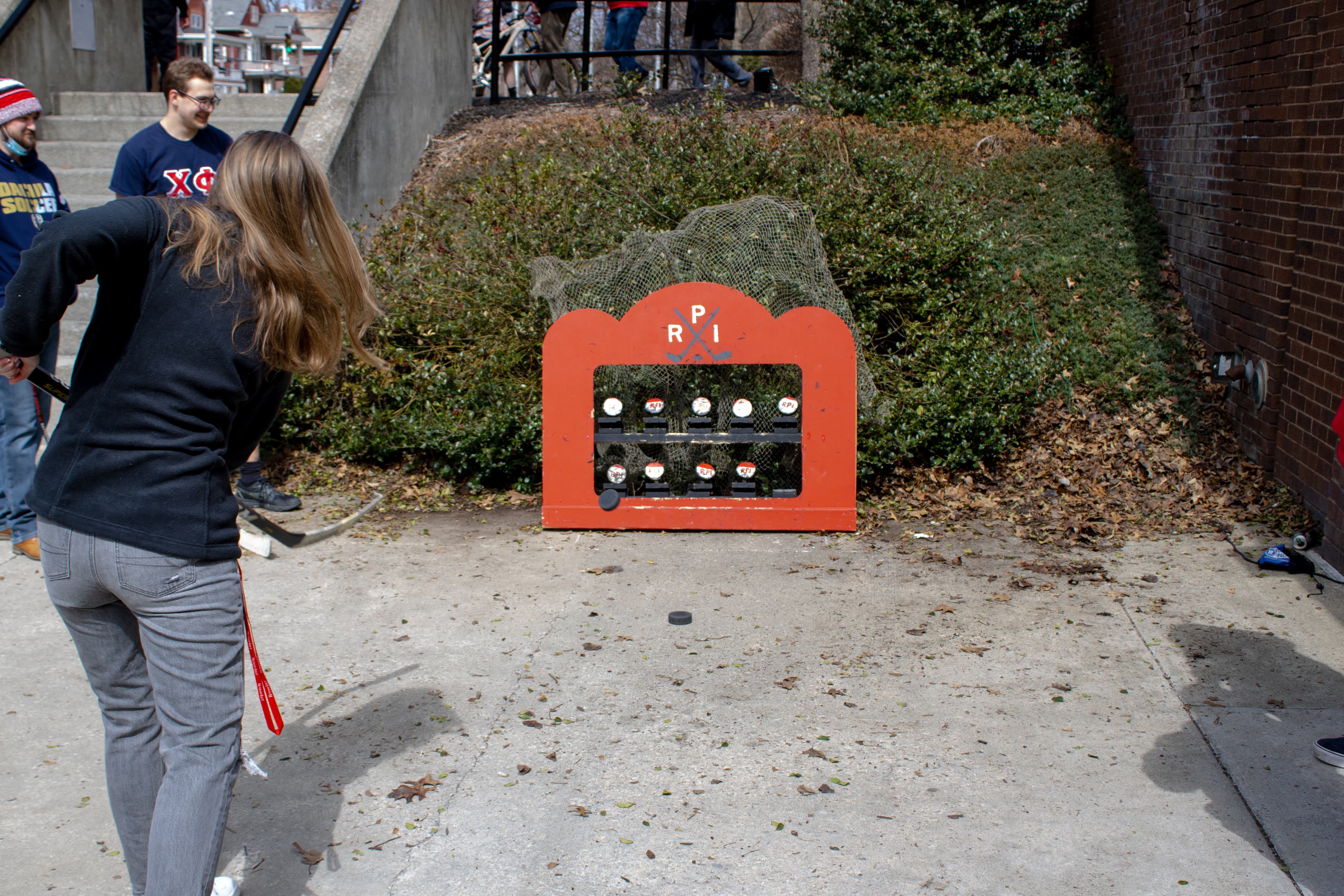 Some of the campus fraternities ran games, including a toilet paper toss by Theta Xi, where participants attempted to toss a roll of toilet paper into a makeshift toilet. Another game was a hockey shooting game by Chi Phi (pictured right), perfect for the RPI hockey fans who want to test their accuracy. This game was a lot harder than one would think, especially without any experience with a hockey stick.