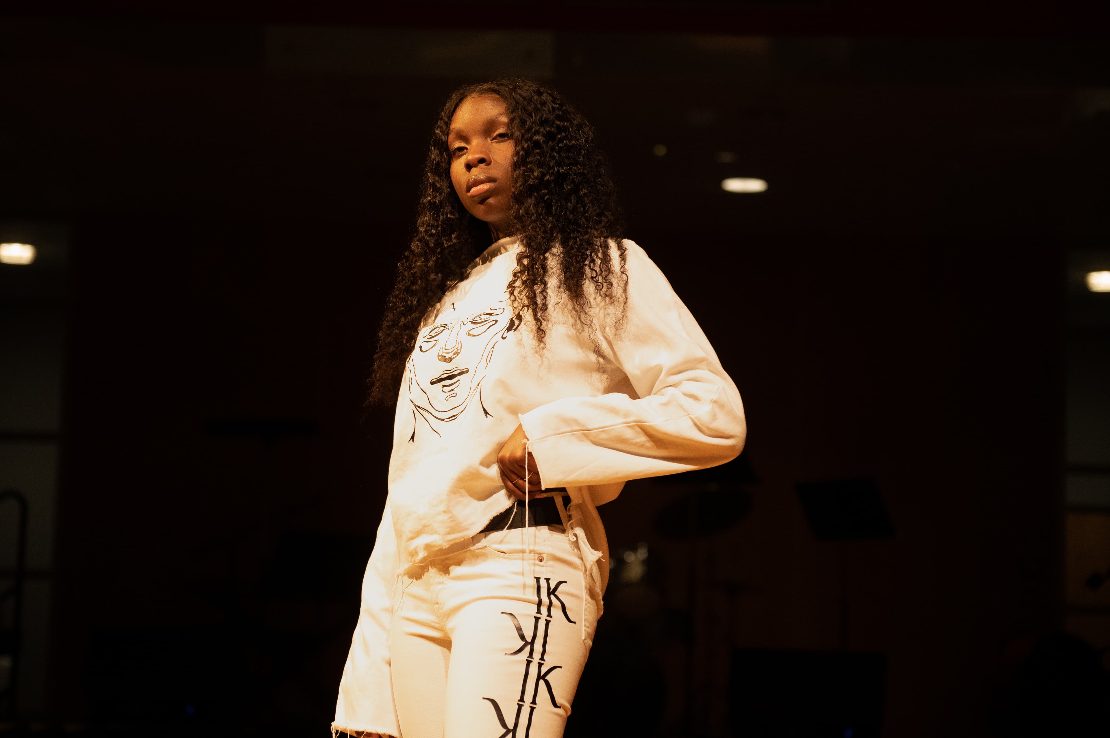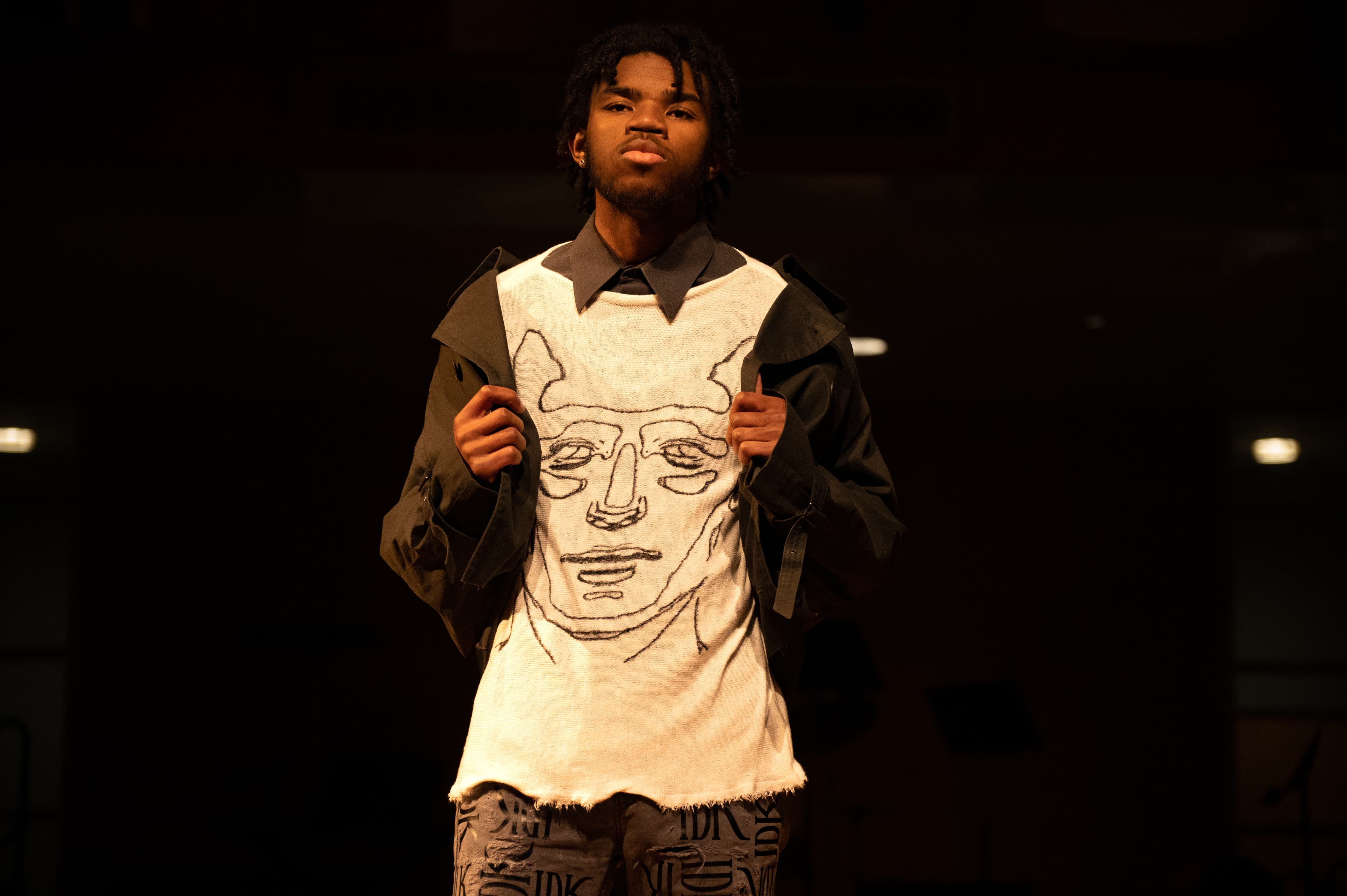 The next designer was IDK IK, or I Don’t Know I Know, which focused on a collection of sweatshirts and relaxed clothing. Featuring unique designs on half zips and streetwear, this designer showed how fashion design was not limited to fancy clothing—it’s a versatile art form which can apply to everything from formal occasions to everyday wear. One unique element of this designer's set was a piece that closely resembled a straightjacket, a stark contrast to the other pieces presented in this show.