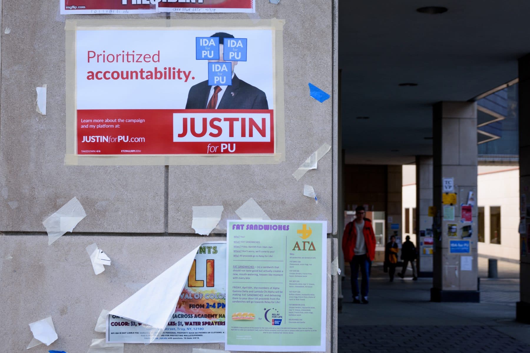 One poster, on the southeasternmost column of the Center for Industrial Innovation, had three stickers declaring “Ida for PU” placed over Etzine’s photo. Another poster, located on a column between the Jonsson Engineering Center and the Darrin Communications Center, had one “Ida for PU” sticker covering “PU” in “Justin for PU.”