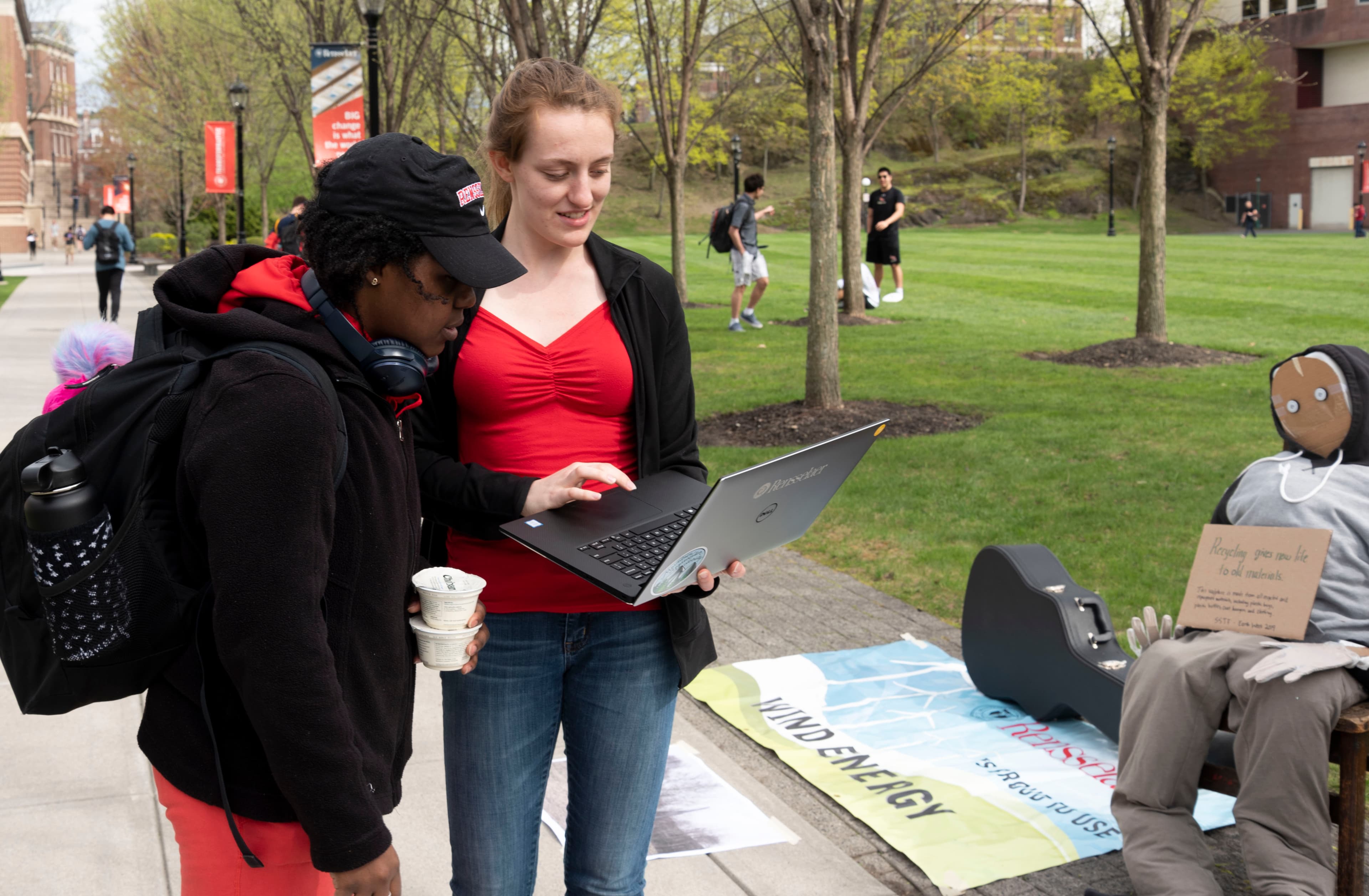 Students solicited signatures for the petition during the demonstration and brought the total from 180 at noon to 250 by 4 pm. They also encouraged students to write on a paper banner taped to the sidewalk that was headed with the prompt: “Why not be more sustainable?” By 4 pm, the banner was full of statements that ranged from specific initiatives that Rensselaer and the United States government should take, to how each individual can play a part in lessening the negative effects of climate change.