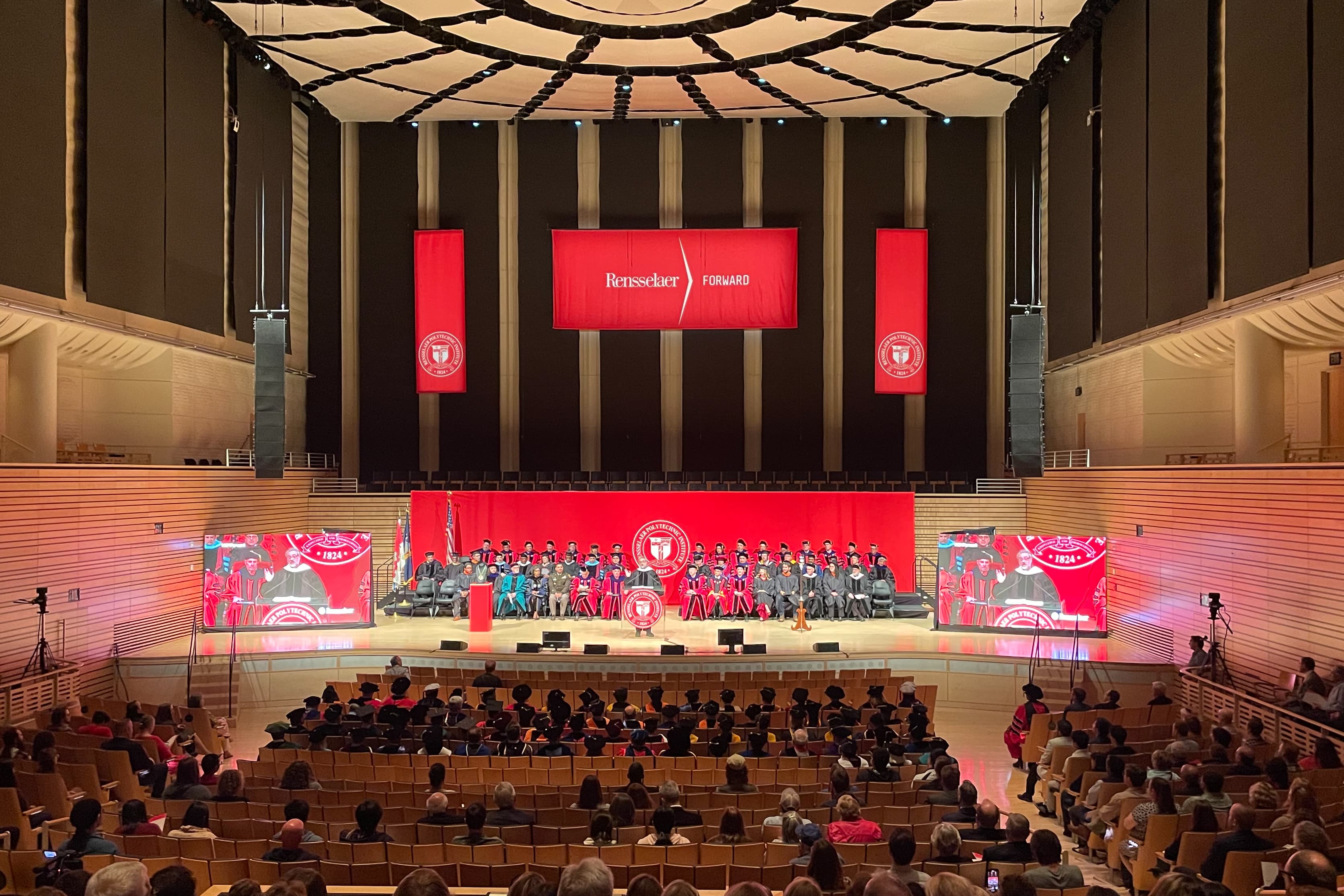 Students and administrators came together to hear speakers introduce President Schmidt at the EMPAC Concert Hall. Performers included the Scotia-Glenville Pipe Band, the ROTC Joint Service Color Guard, Marina Robles ’24, the Rensselaer Student Chorus, and the Calliope Brass Ensemble. Speakers included Rabbi Robert Kasman, Chairman of the Board of Trustees Arthur Golden ’66, Congressman Paul Tonko, Major General John Andonie ’03, Troy mayor Patrick Madden, Eben Bayer ’07, Chief Engineer of Boeing Gregory Hyslop, former President of MIT Leo Reif, President of Spelman College Mary Schmidt Campbell, Grand Marshal Caitlin Bennett ’22G, Graduate Council President Kristoff McIntosh ’24G, President of the Rensselaer Alumni Association Meghan Lenihan Moulder ’10, Executive Director for Health and Wellness Leslie Lawrence, Faculty Senate President Nishtha Langer, Presidential Search Committee chairperson John Kelly III ’78, and a blessing from Father Larry Rice.