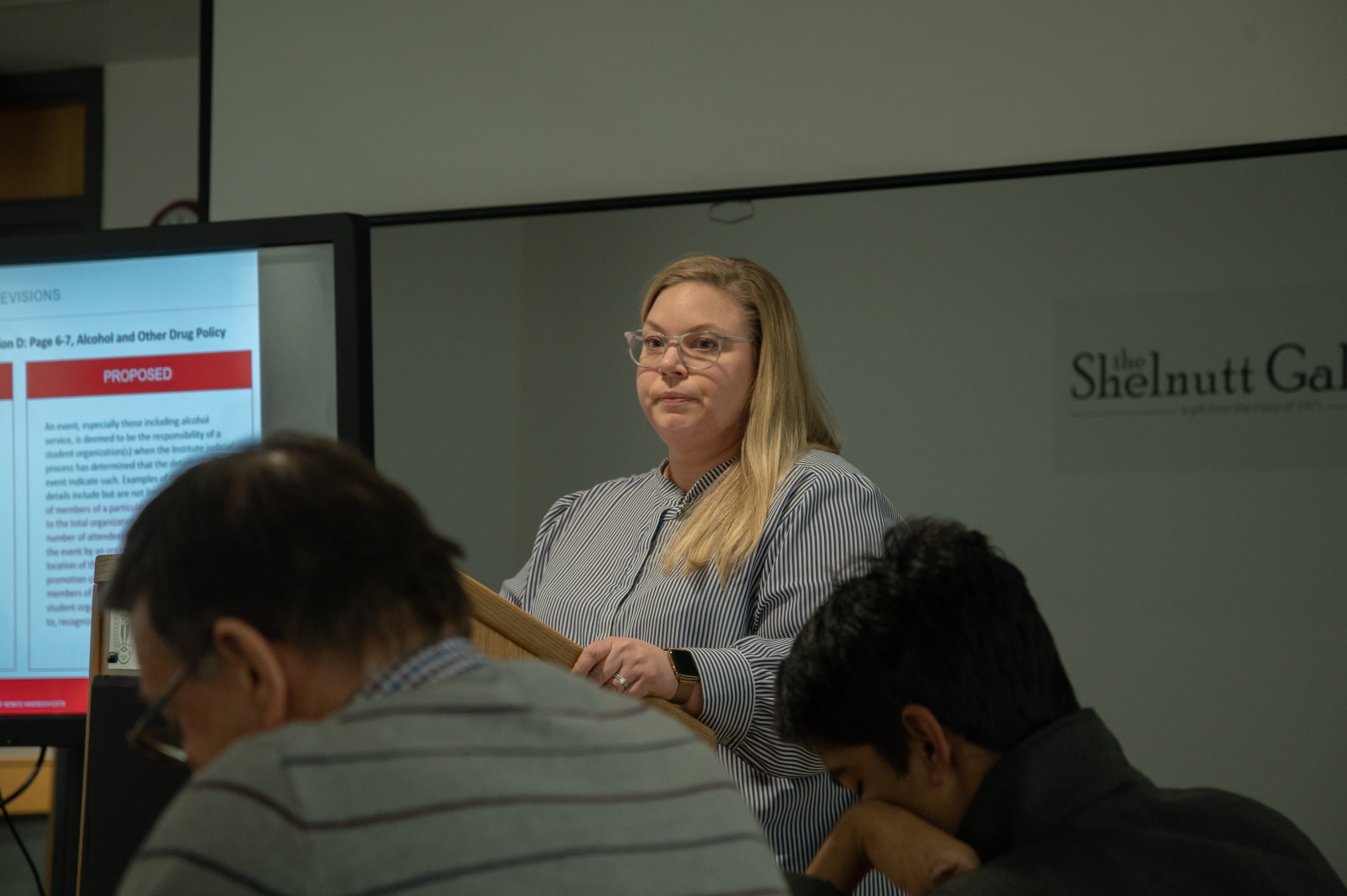 Director for Student Rights, Responsibilities, and Conduct Samantha Tymchyn and Associate Vice President and Dean of Students Travis Apgar presented changes to the Rensselaer Handbook of Student Rights and Responsibilities. The proposed changes were to the following sections: Institute Regulations on Alcohol, Specific Area Policies for Alcohol, Rensselaer Good Samaritan Policy, Interim Suspensions, Judicial Inquiry & Appeals, and Exotic Dancers.