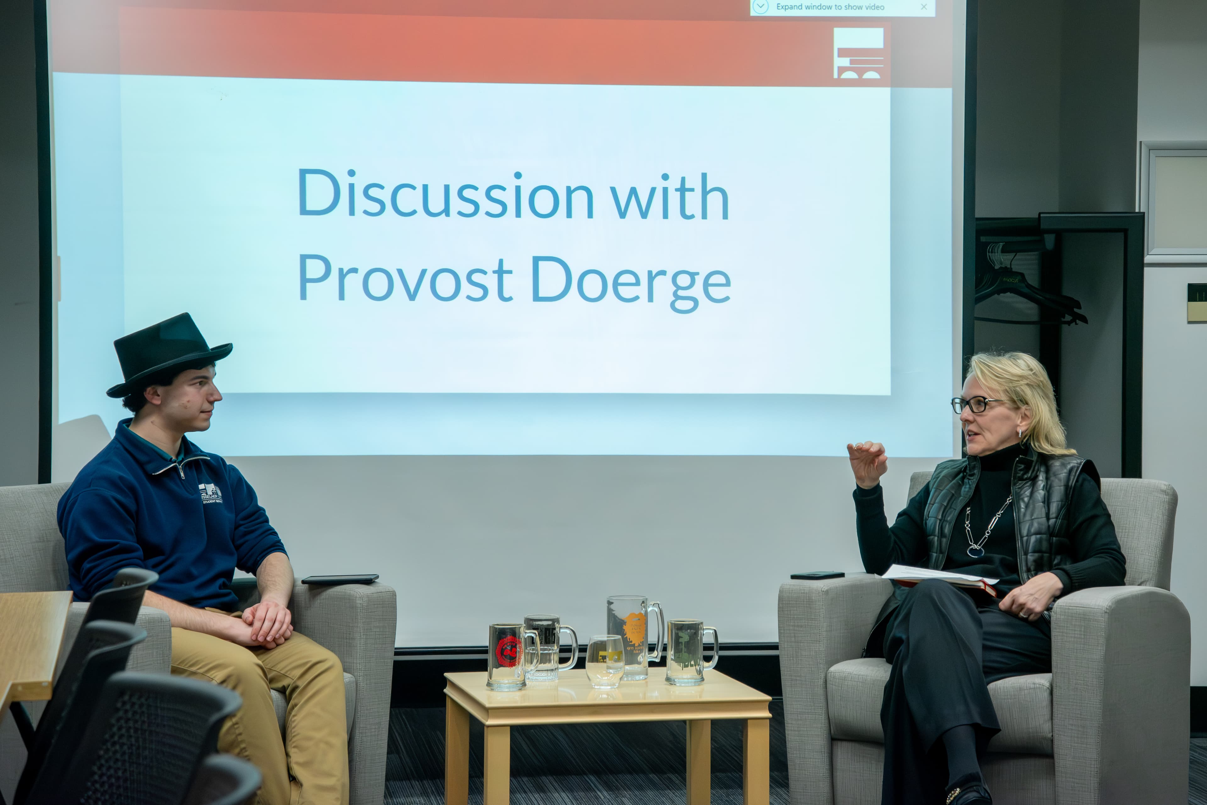 The conversation then shifted to the Provost’s recent change in the excused absence policy in which Viner asked Doerge for her rationale in making the change. She stated that “you guys are young adults who need to learn how to balance your time and you don’t need to have a written excuse to be responsible for your own time.” Importantly, Doerge mentioned that she did make a mistake with how the policy change was rolled out, but she won’t retract the change. Given the opportunity to announce the change again, Doerge wanted to socialize the change and discuss it more with the student body and faculty.