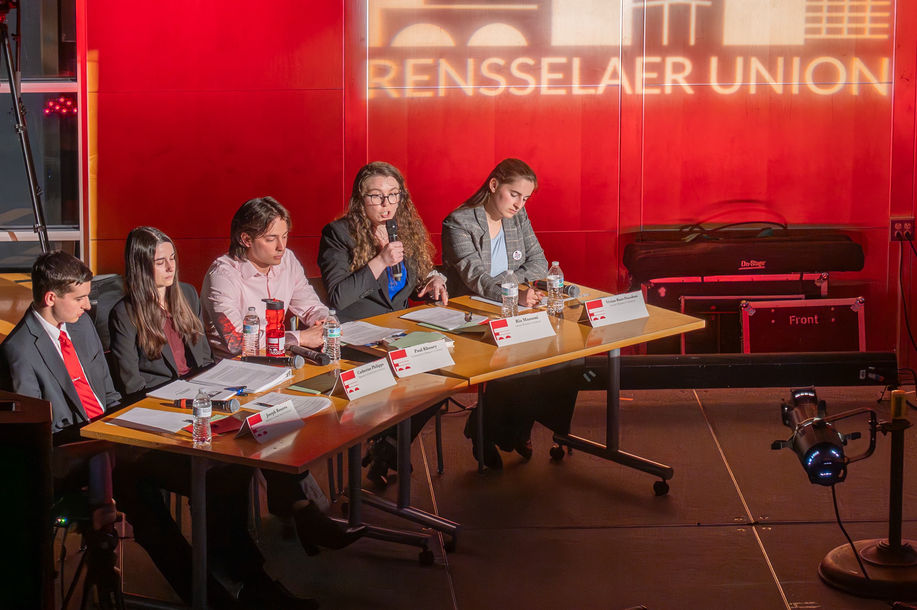 Five candidates took the stage for the Grand Marshal Week debate moderated by Elections Committee Chairperson Timothy Miles ’24. The debate offered one last chance for the candidates to present themselves to the student body and share their opinions on various topics and issues. As per previous years, candidates responded to both curated questions and questions from the audience in the Rensselaer Union.
