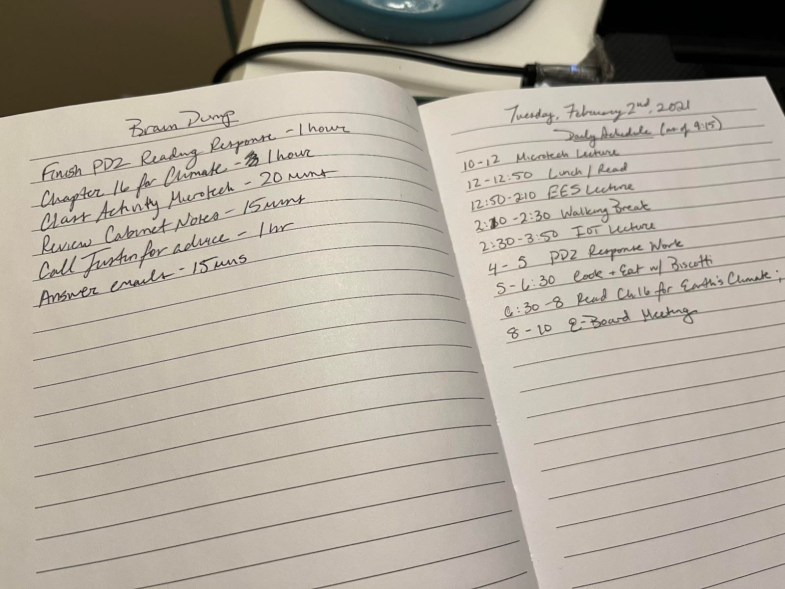 For planning my week, I use Google Calendar. I put every class, meeting, appointment, or planned activity in it as far in advance as possible. To plan my days, I use a simple journal, because studies have shown that writing is better for memory retrieval. On the left page, I brain-dump every task for the week and the time it will take from the assignment sheet. On the right page, I write time slots based on my Google Calendar for food, work, and breaks.