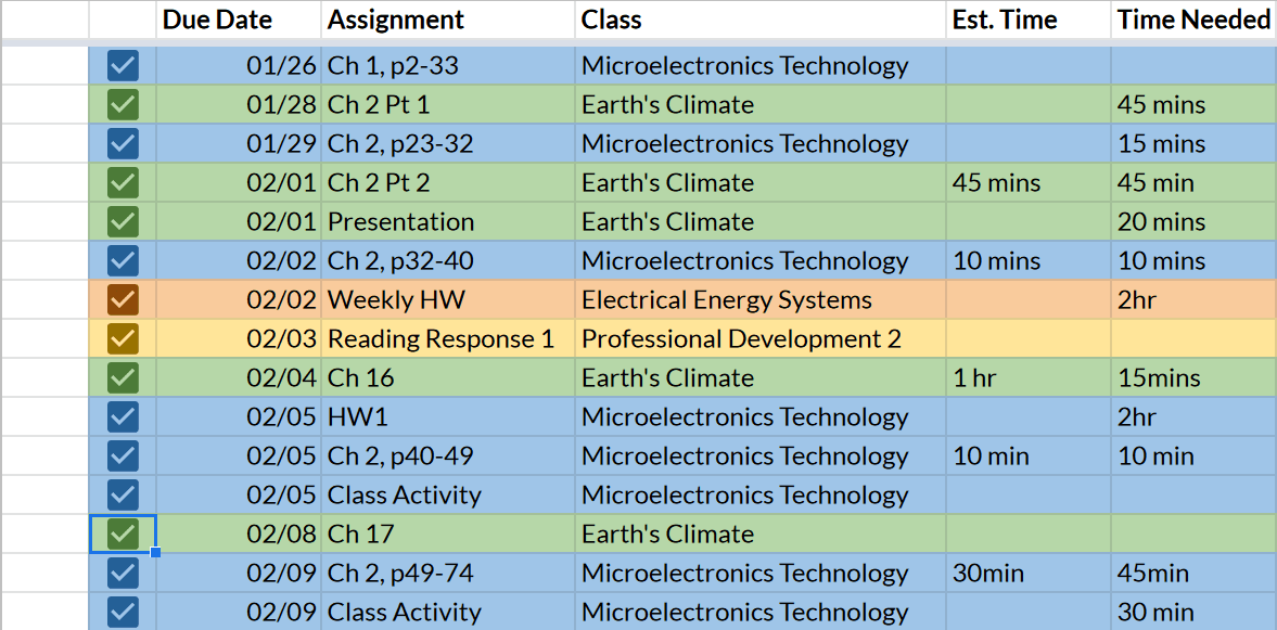 For me, a simple spreadsheet goes a long way when planning the semester. I start off by loading all of my deadlines into an assignment spreadsheet (template linked here) organized by class, due date, and estimated completion time. I even have categories for “Grand Marshal” and “Job Applications,” since those will take up time in my day.