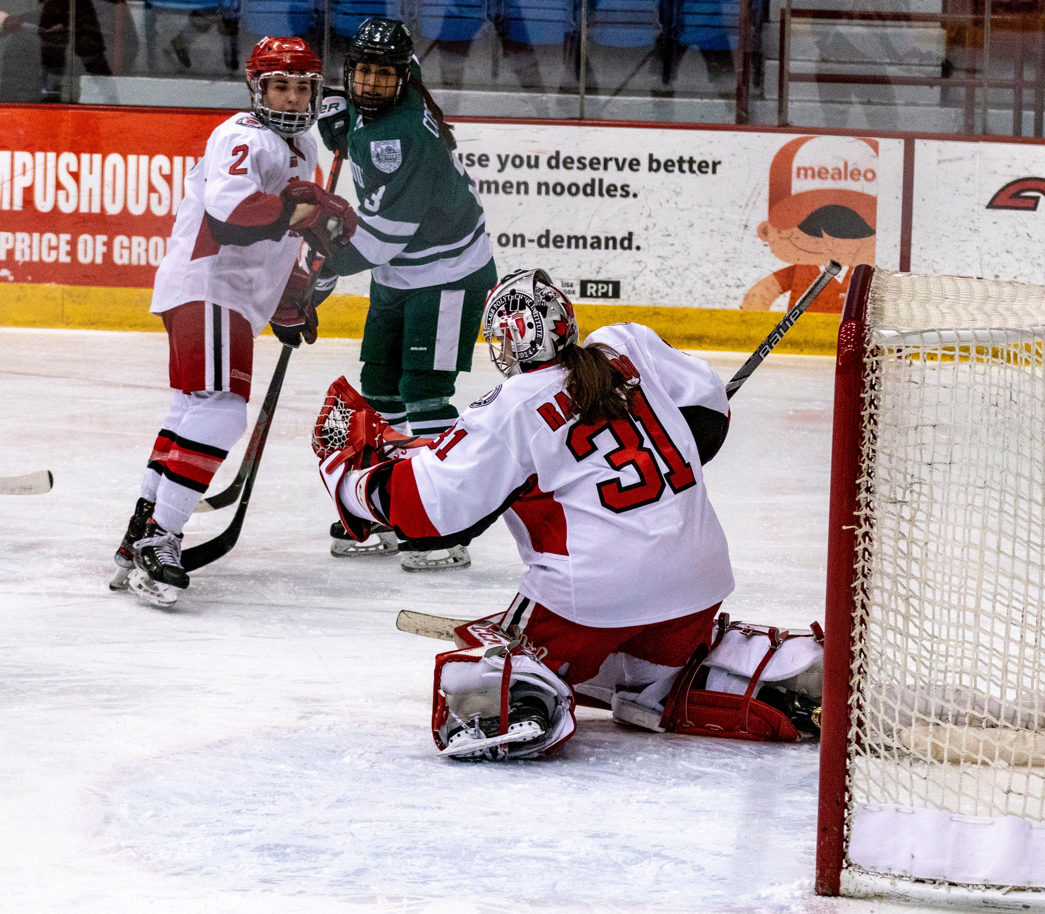 The second period started off very close, with possession ebbing and flowing between the two teams. With 16:58 left in the period, the puck bounced off of the boards behind the goal and out in front to Bowlby, forcing Rampado to make a great reaction save to preserve the scoreline. Less than a minute later, there was a goalmouth scramble in the RPI defensive zone, but fortunately for Rampado, no chance was too threatening.