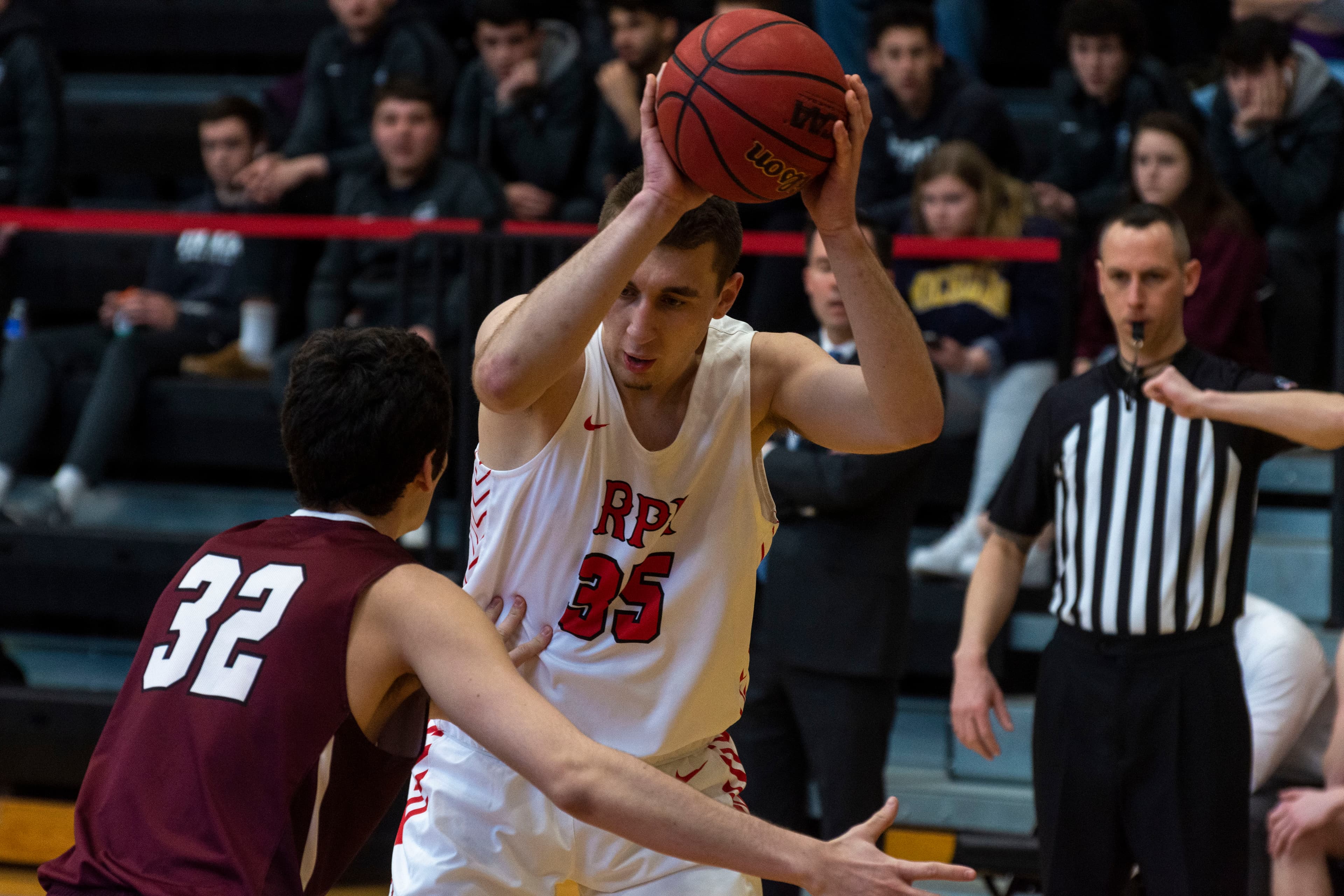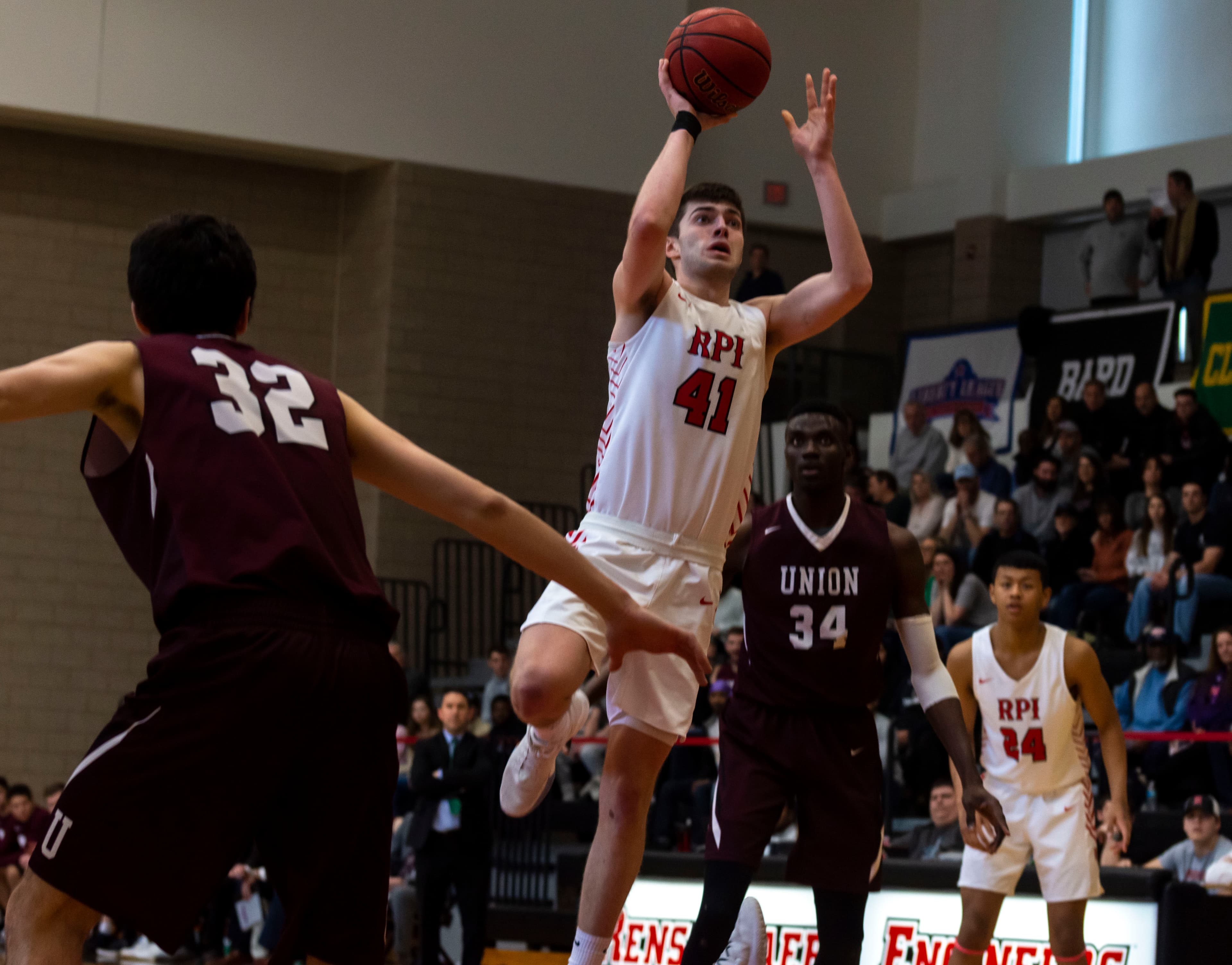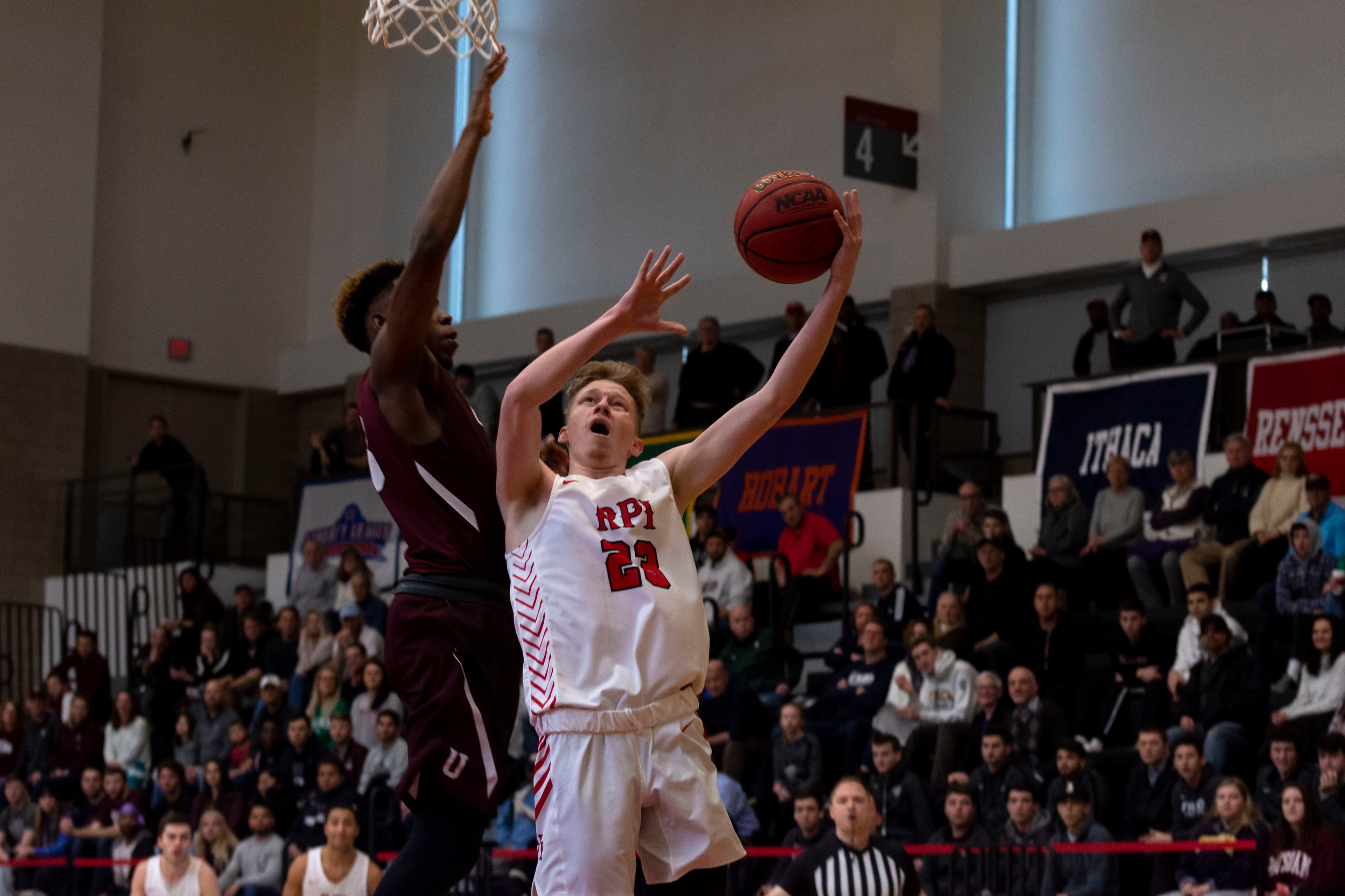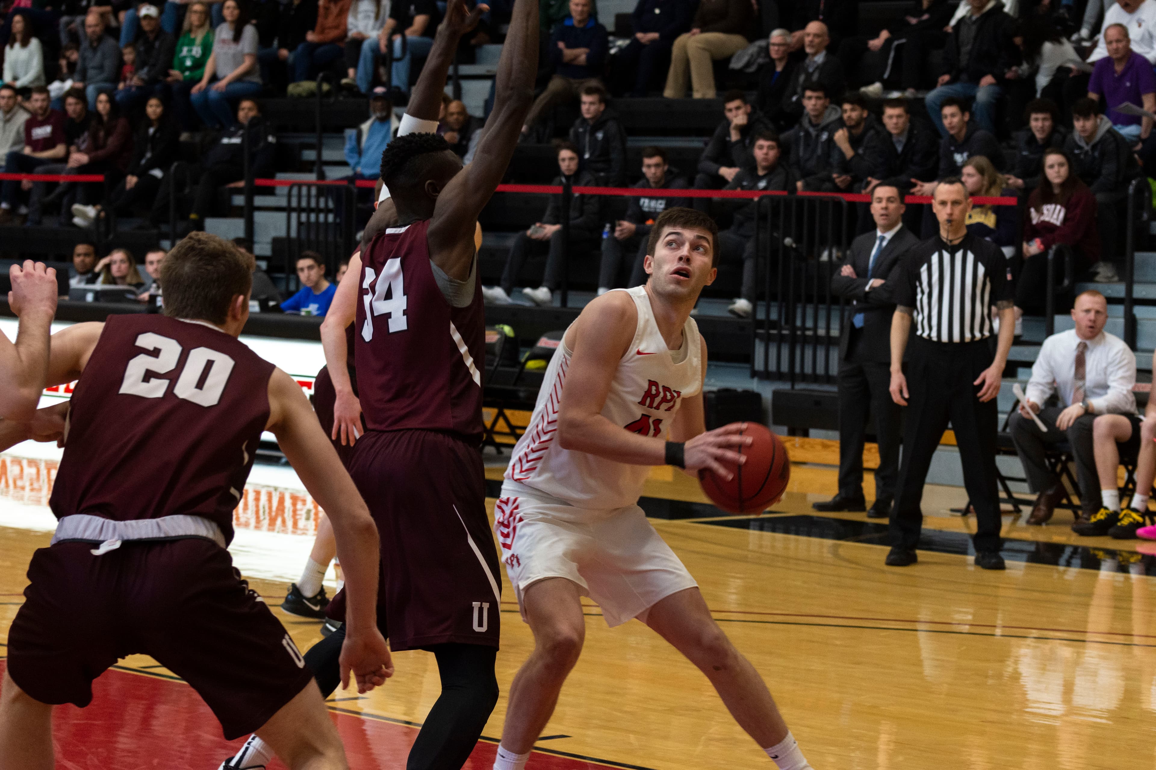 RPI may have been leading in terms of the scoreline, but Union’s presence was much greater. The Union bench and fan section were so lively that one would have thought the game was being played in Schenectady. With 4:50 left to play in the half, Concannon converted an and-one to put the Dutchmen up 25‒24. The Engineers stayed strong and regained their lead. At the end of the half, RPI lead 33‒32 with the lead point scorers being a tie between Mahoney and Memmelaar for the Engineers and Jefferson for the Dutchmen, all at nine.