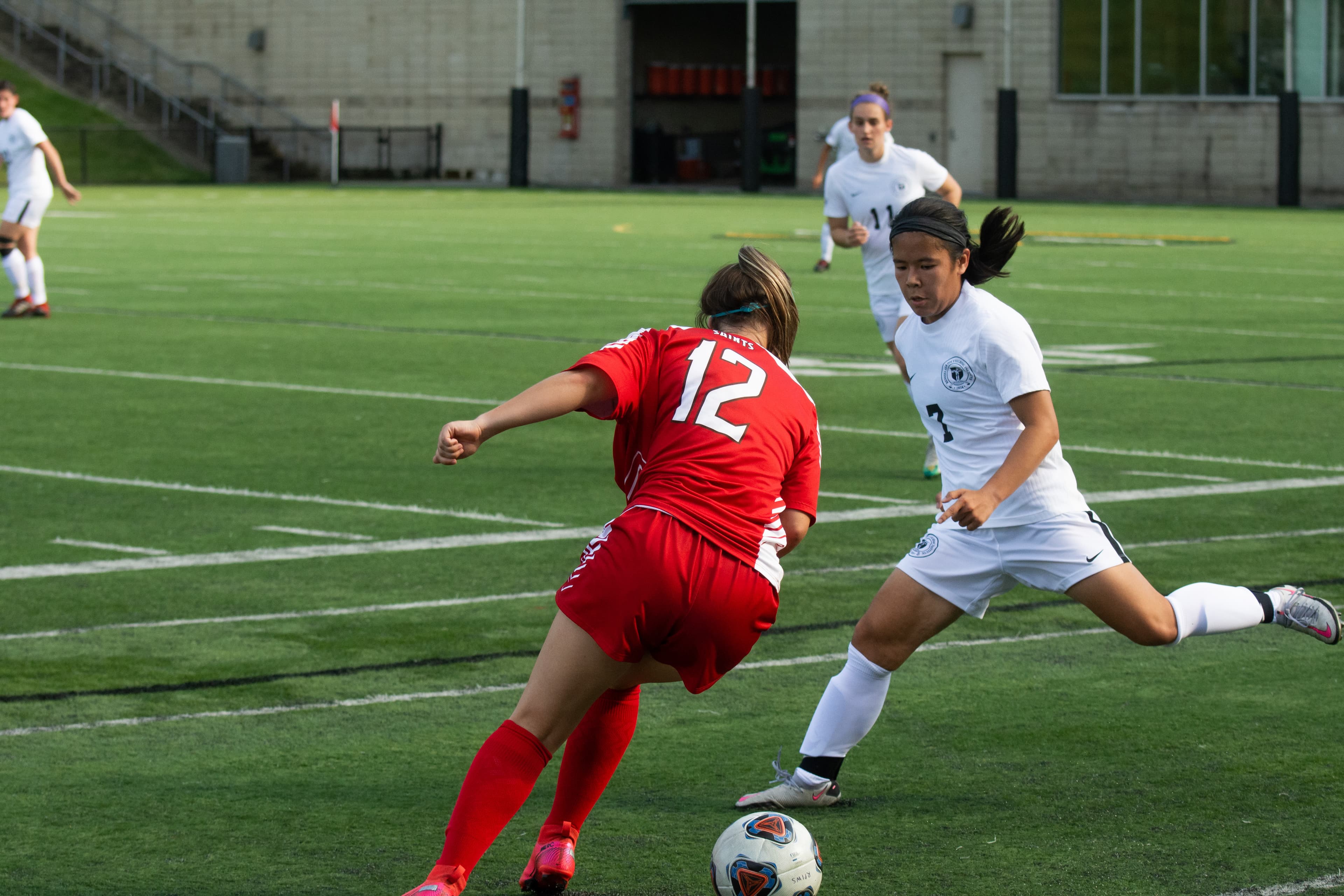 For the first three minutes, neither squad seemed to dominate. In the fourth minute, Saints midfielder Isabel Silvia settled a punt at the half-way line. She turned towards goal and played a through ball over the top to forward Tyler Potter. Potter reached the ball just outside of the 18-yard box and took a shot. Although the strike wasn’t clean, the bouncing shot snuck off the far post and in to give the Saints the lead early on.