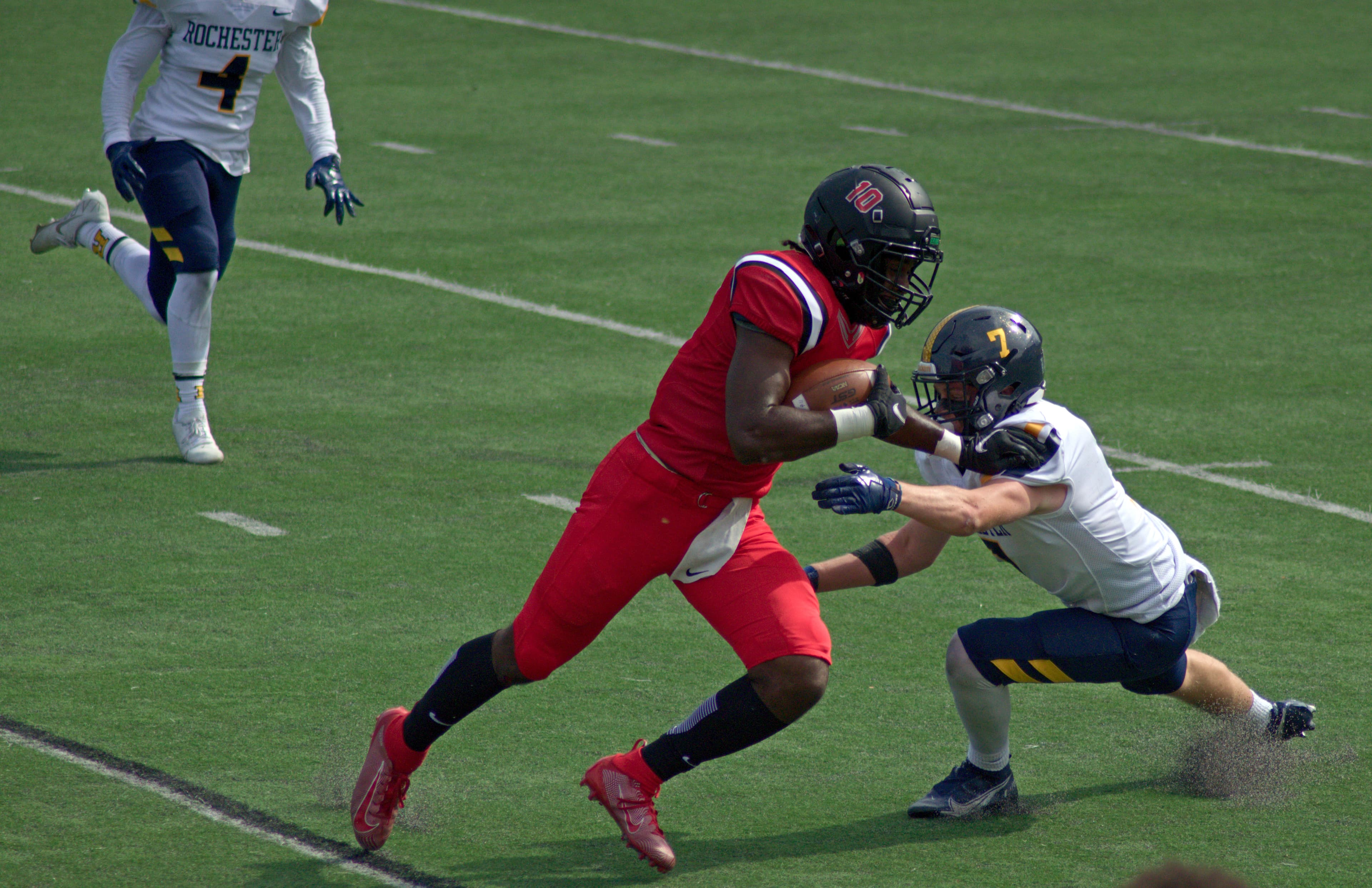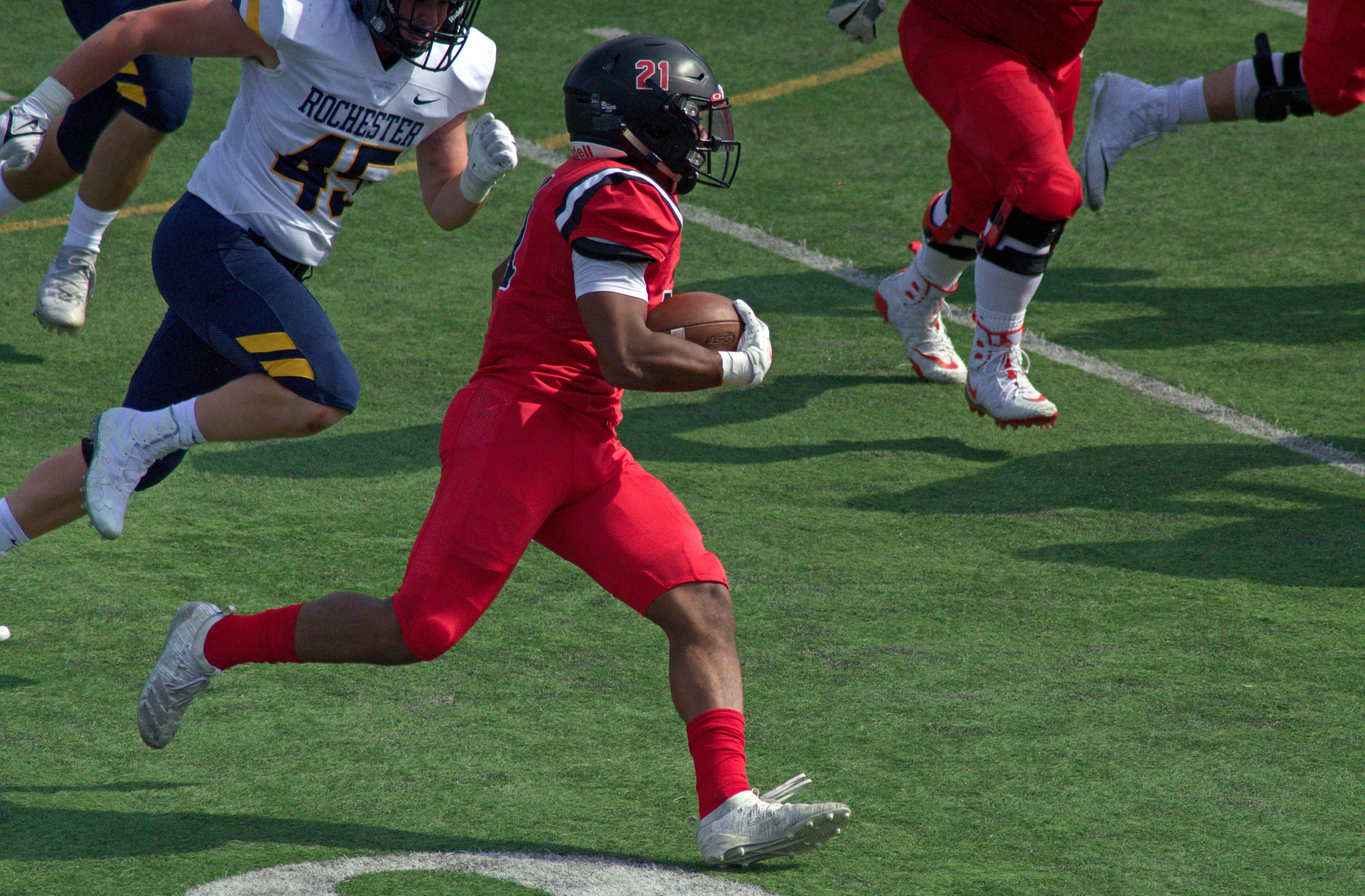 On the first play of the second quarter, Rochester quarterback Sean Casey took the snap and rolled out to his left. Casey made a throw on the run and, despite the tight coverage of defensive back Carlos Davis ’23, wide receiver Liam McManus was able to hold onto it and was down at the five-yard line. On second down, Casey faked the handoff to running back Will Varney and took off to the left. The Engineer defense reacted late and were closing down on Casey, but, just before they could reach him, he dove into the pylon for the score. After a minute of play in the quarter, the Yellowjackets tied it up 7‒7.
