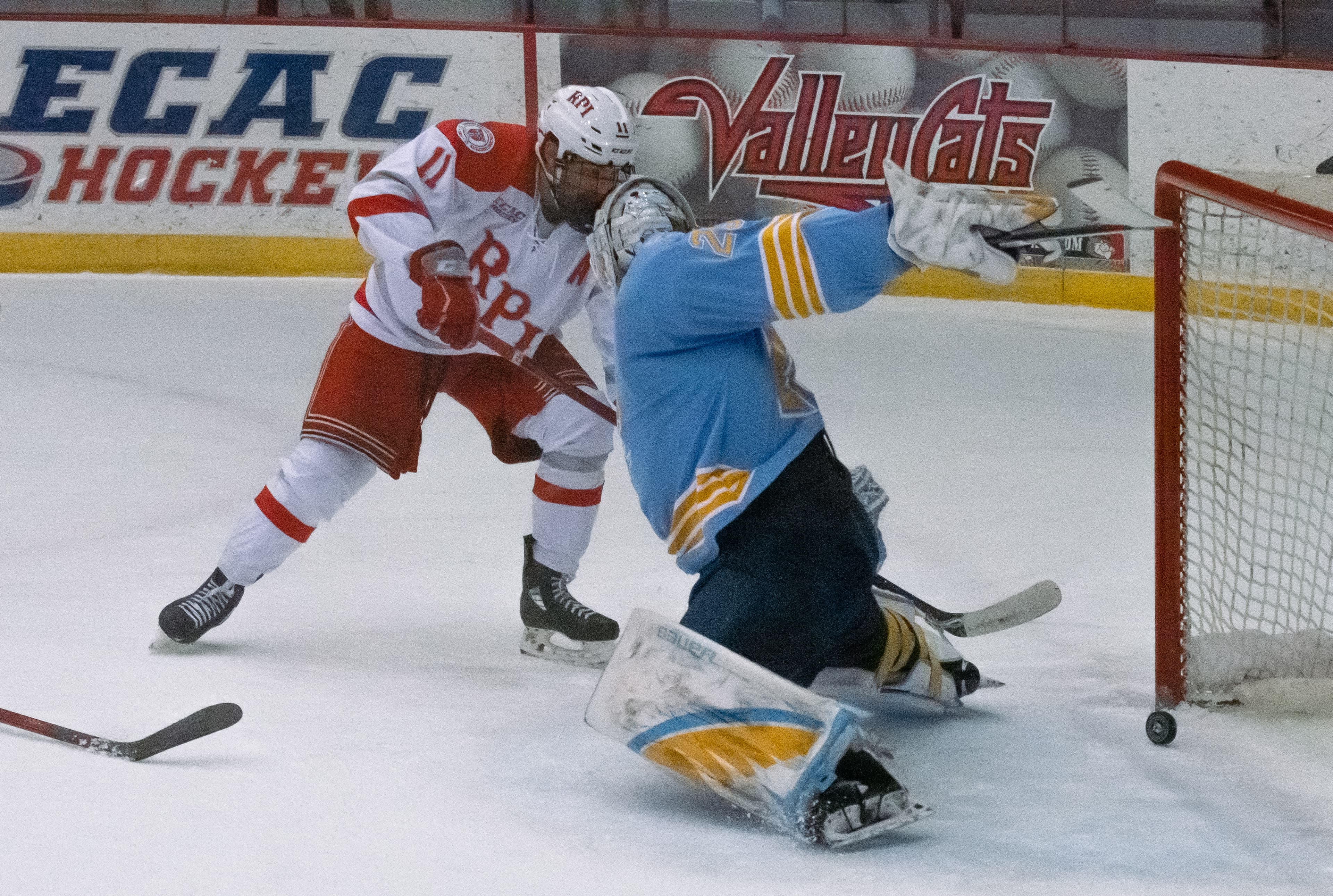 Three minutes after Addamo’s goal, a speedy Isaiah Fox skated around the outside of an Engineer. Fox cut towards center and managed to slip it under Marshall’s pads to bring the score to 2‒1. Less than two minutes before the end of the period, RPI went on the power play off of an interference call, but were not able to score while they had an extra skater. The period ended 2‒1.
