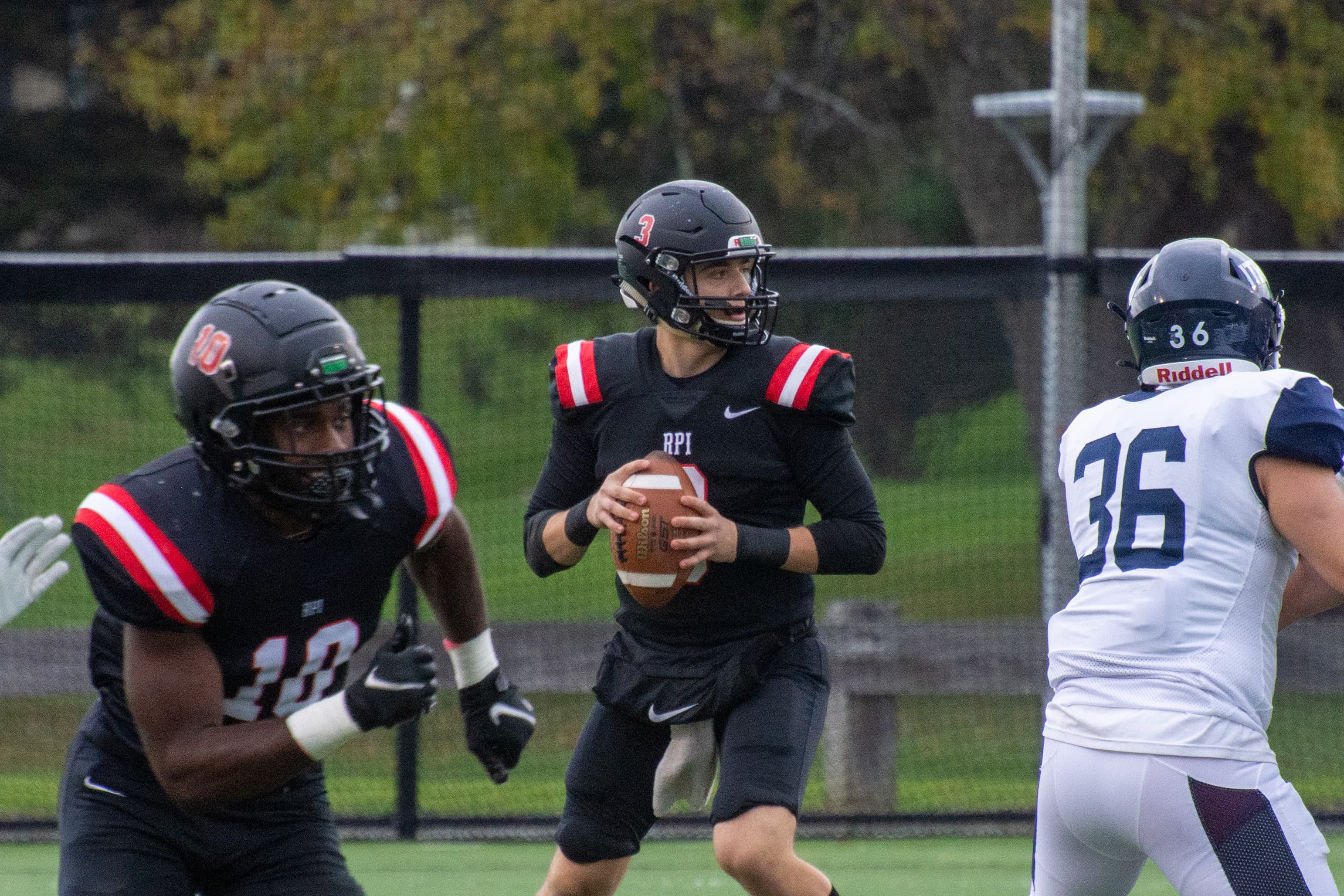 The Engineers were stopped on the first play of the second quarter, forcing them to punt. The Bombers gained possession at their own 33 and marched downfield, but were ultimately stopped by the Engineers' great defense, including an athletic swat by Spencer Brockdorff ’23 that forced an incompletion. On the Engineers’ next drive, Marinopoulos collapsed from a left knee injury. He was replaced by Matt Petercuskie ’23 for the rest of the game. Possession was regained by Ithaca, but neither team was able to get anything done on offense for the rest of the half. Going into the locker room, RPI led 7‒0, the only time this season Ithaca has gone scoreless in the first half.