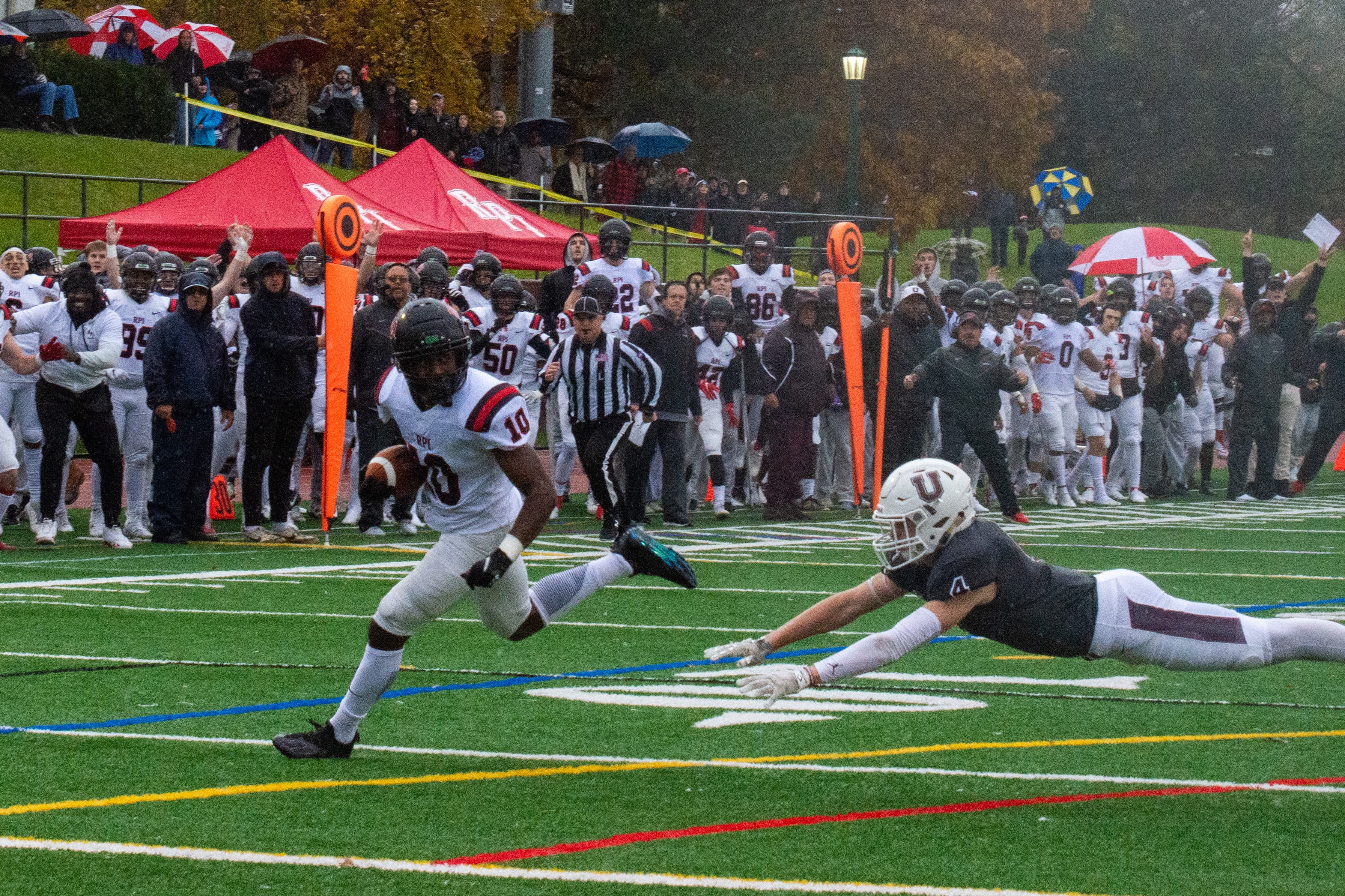 The Engineers were gaining yardage, but it did not seem fast enough. They faced fourth and 6 at the Union 19 with 1:07 remaining—obviously a field goal would not suffice. Marinopoulos took the snap and threw a quick pass to Munoz Whatts to his right. When Munoz Whatts made the catch, he had about ten yards to get the first down. He fought for every inch and barely earned the Engineers a first down to keep their hopes alive. On the next play, Marinopoulos threw a pass to the back left corner of the end zone to find Vinnie McDonald (Gr), but an ineligible receiver penalty cut the celebrations early. On second and 11 at the Union 13, Marinopoulos threw a dart to McDonald. He hauled it in and rushed over to the fan section to celebrate. The touchdown brought the score to 17‒16.