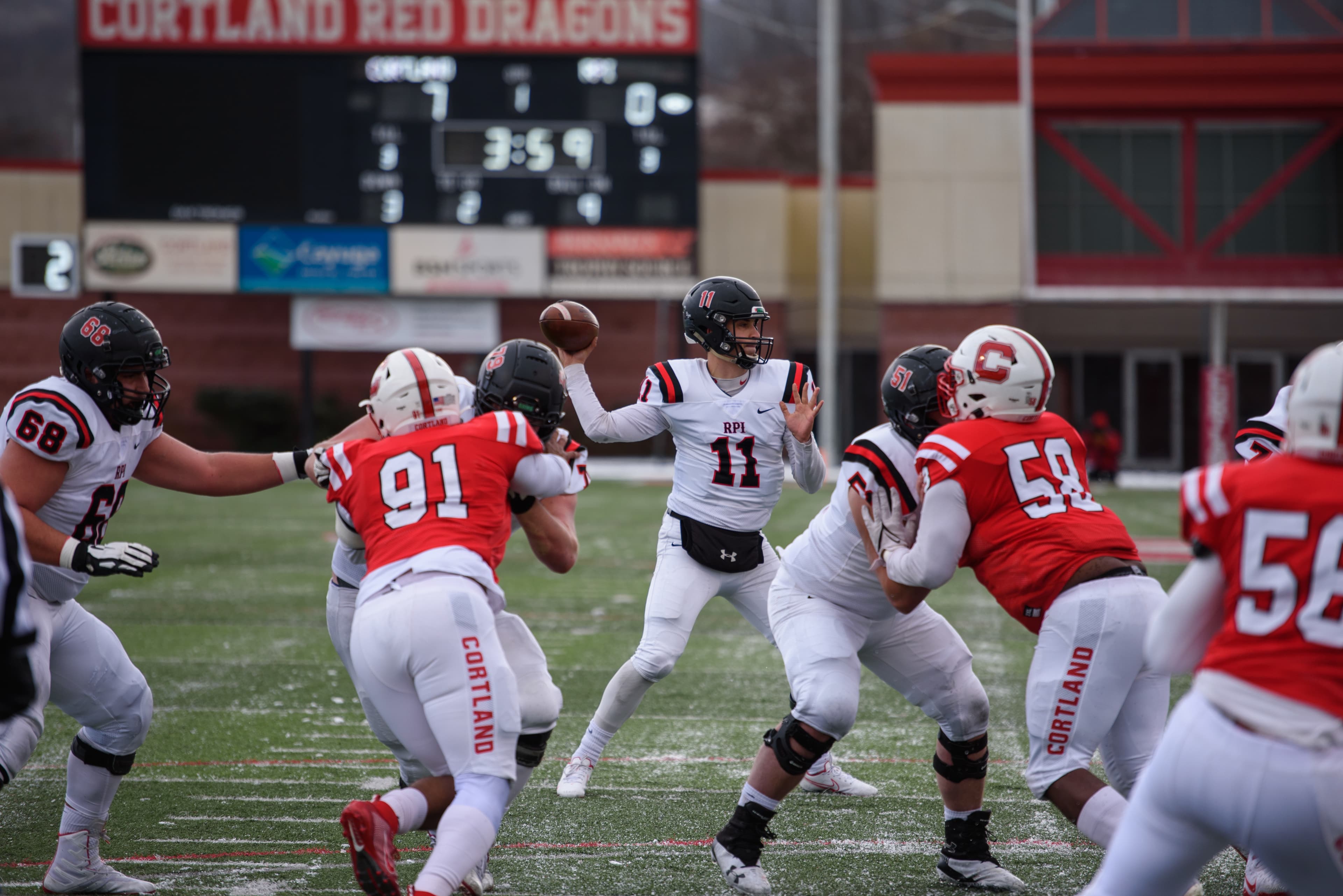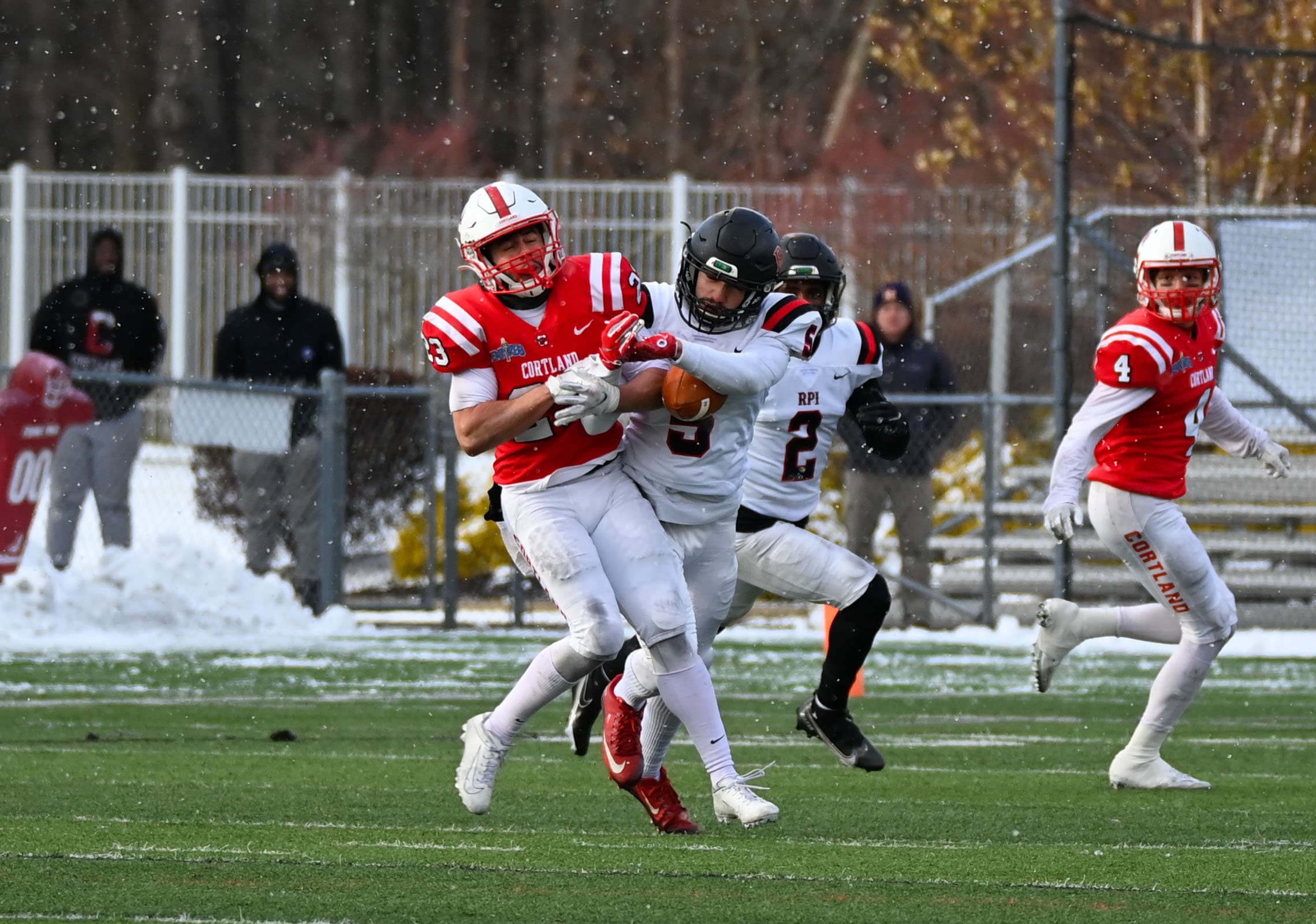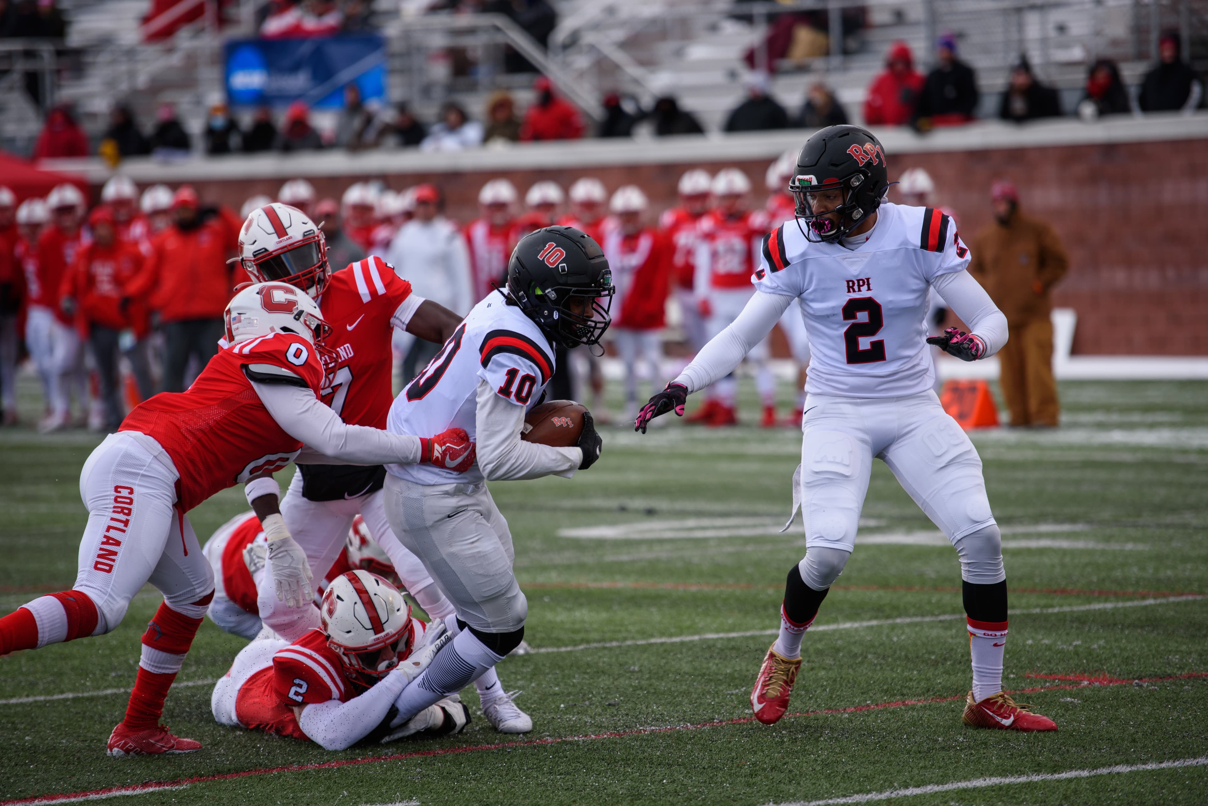 Rensselaer traveled west to Cortland for their second-round matchup against the Red Dragons. The freezing weather and snowfall were less-than-optimal conditions for a playoff football game.