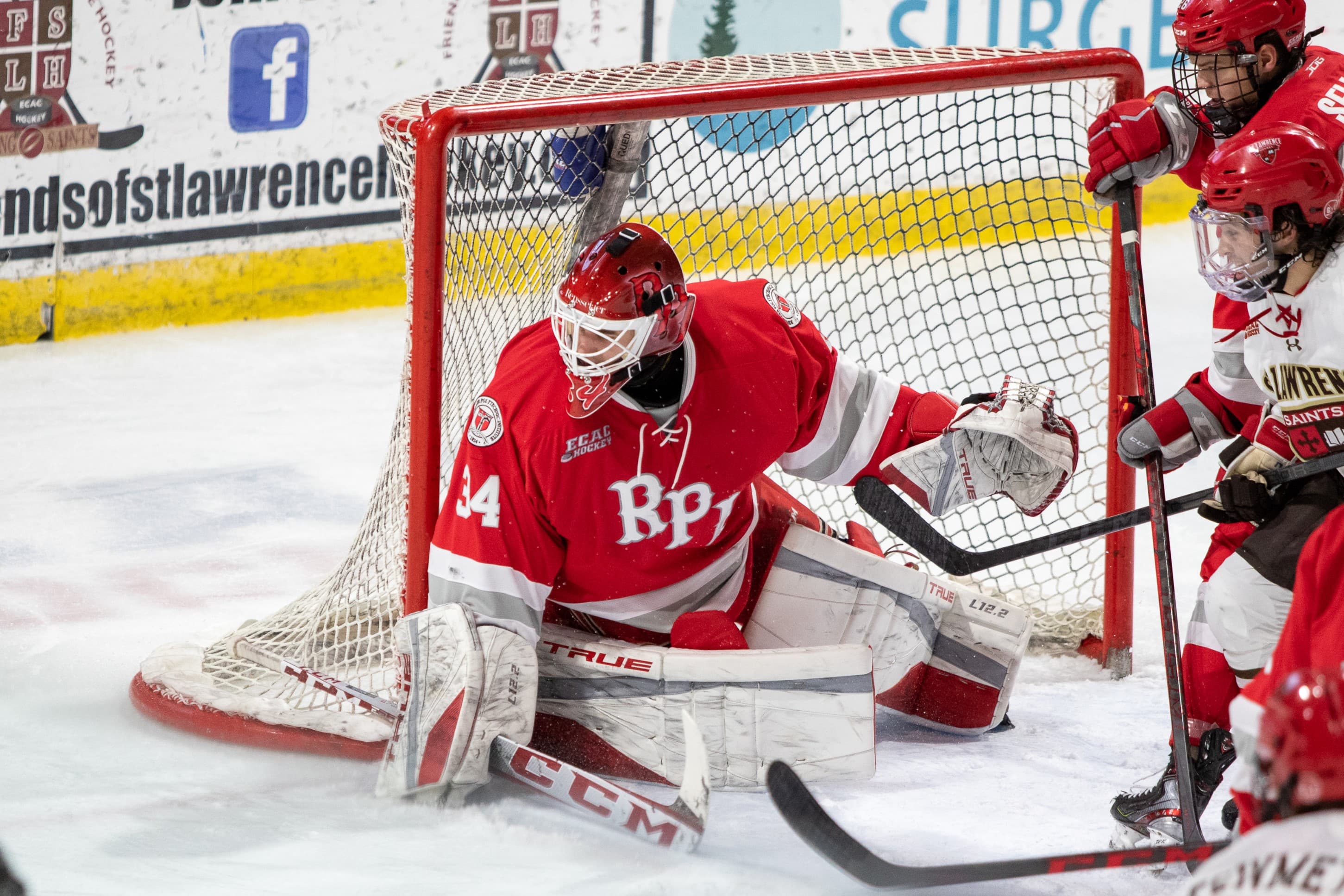 Both teams played at a lightning-quick tempo coming out of the locker room. The Saints were particularly dialed in, outscoring the Engineers 9‒3 in the first half of the second period. The Engineers had a scoring opportunity with over eight minutes left in the period when Hallbauer tried to dump the puck into the offensive zone. The puck careened off the glass unexpectedly and slid towards the St. Lawrence goal, and Adams dove to push the puck wide with his stick. Reid Leibold pounced on the puck, but Adams dove again to stop the shot.
