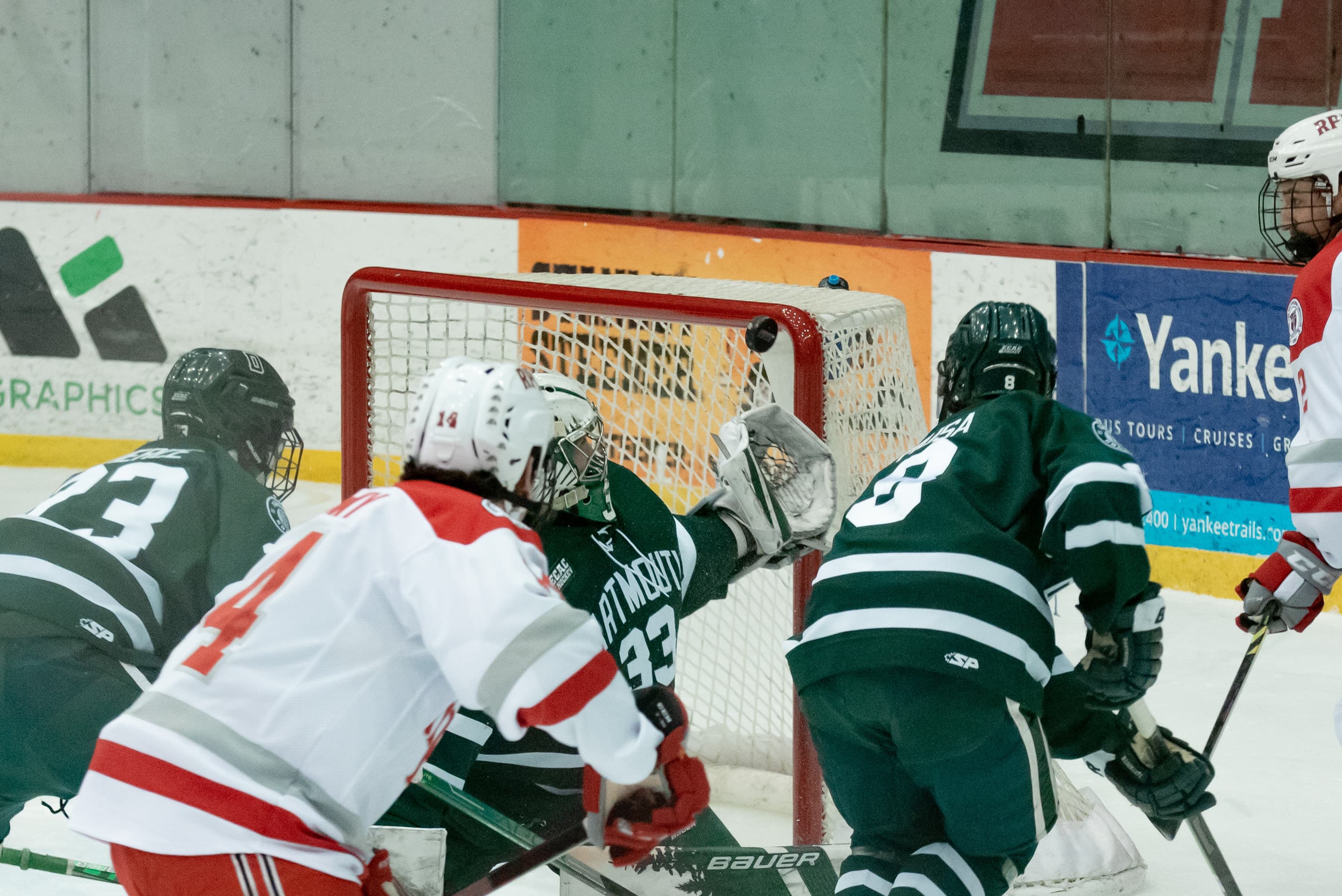 Dartmouth would get a goal back six minutes into the third period. Tanner Palocsik dropped the puck into a gap in the Engineer defense in the right faceoff circle to tee up Ryan Sorkin for a one-timer. Sorkin’s stick exploded out of his wind up, blasting a slap shot top shelf and off the post to bring the Big Green to only one goal behind.