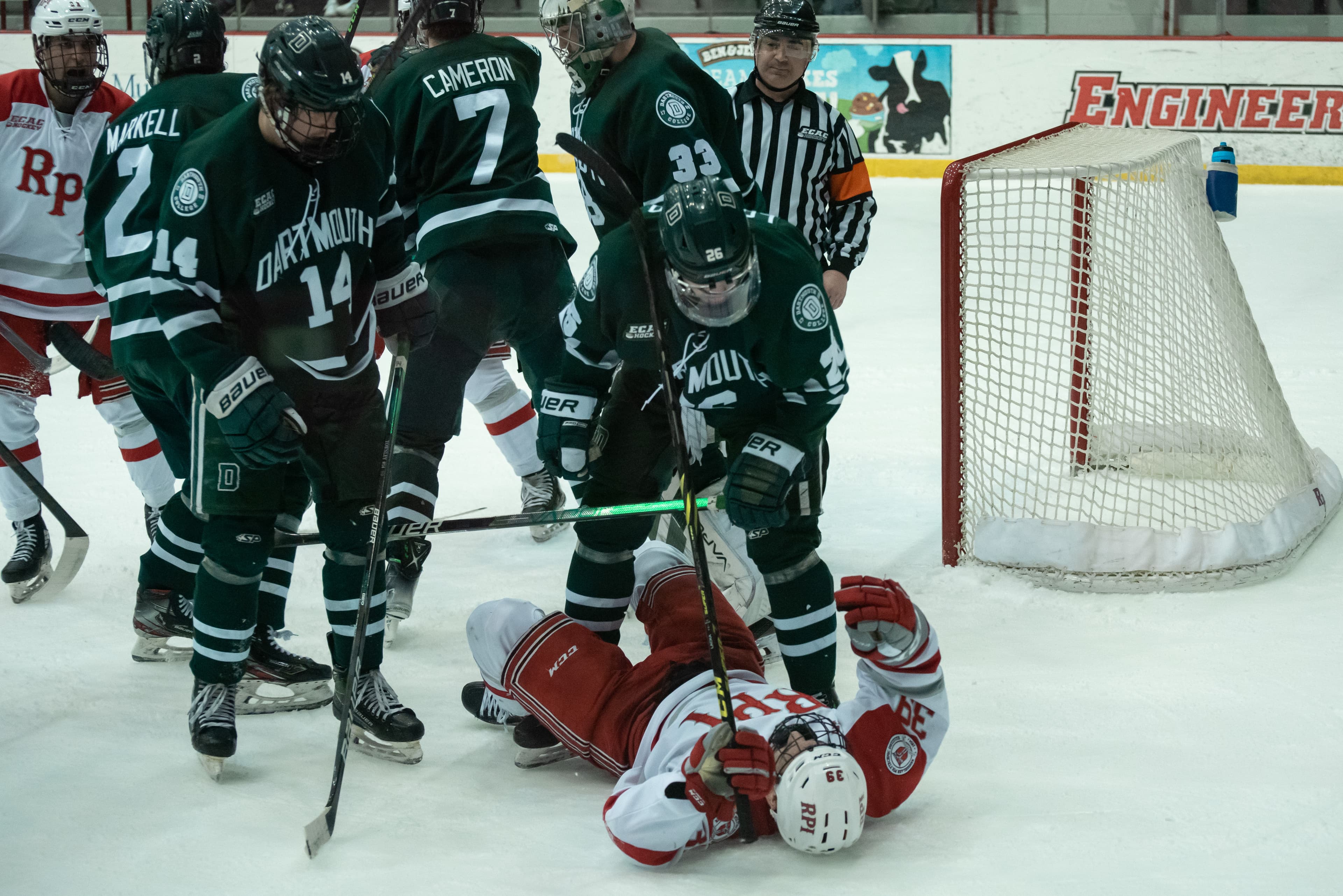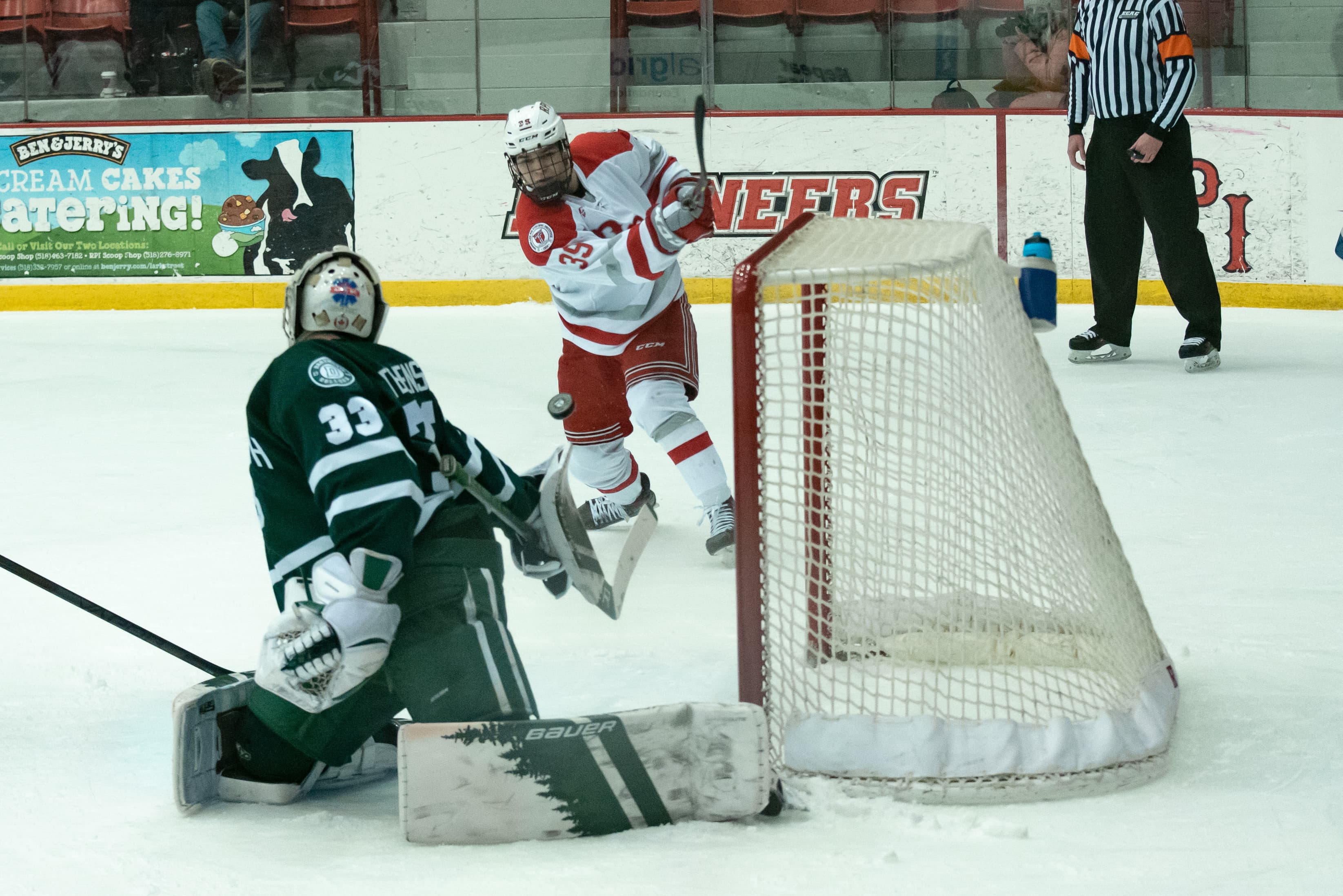 The Engineers extended their lead eight minutes later. After Dartmouth won a faceoff in the RPI zone, Klee intercepted a pass and took it up ice. He passed it over to Linden, and they both entered the attacking zone. Klee got in front of a Dartmouth player, leaving him one-on-one with Stevenson when Linden returned the puck. Klee took the puck on his backhand, then quickly switched back to his forehand to lift the puck past Stevenson. Just his second of the season, Klee’s goal would be the winner. Less than a minute later, Dartmouth’s Harrison Markell took a shot from the wing that was going off target. Watson tried to hit the puck into the corner, but, in a lapse of concentration, inadvertently redirected the puck off the heel of his stick into the net. The flustering flub reduced the lead back to just one with five minutes remaining.