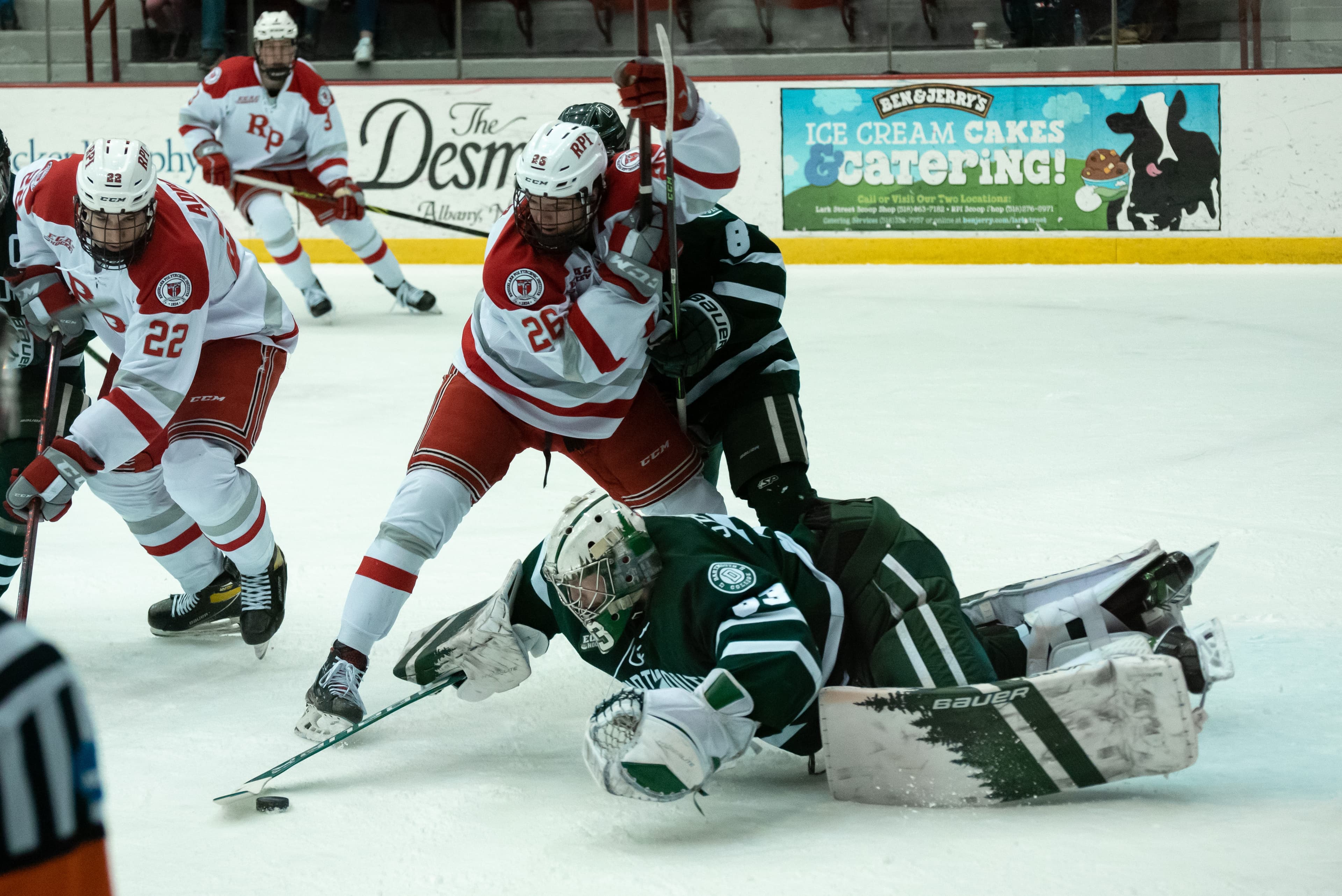 Three minutes later, RPI would have another promising chance. John Beaton ’24 took the puck clockwise from behind the Big Green goal to the high slot and took a low-driven shot. Stevenson made a standard pad save, but the puck rebounded a little too far in front of him. He dove to collect the puck just as Shane Sellar (Gr) and Justin Addamo (Gr) were prepared to jump on it.
