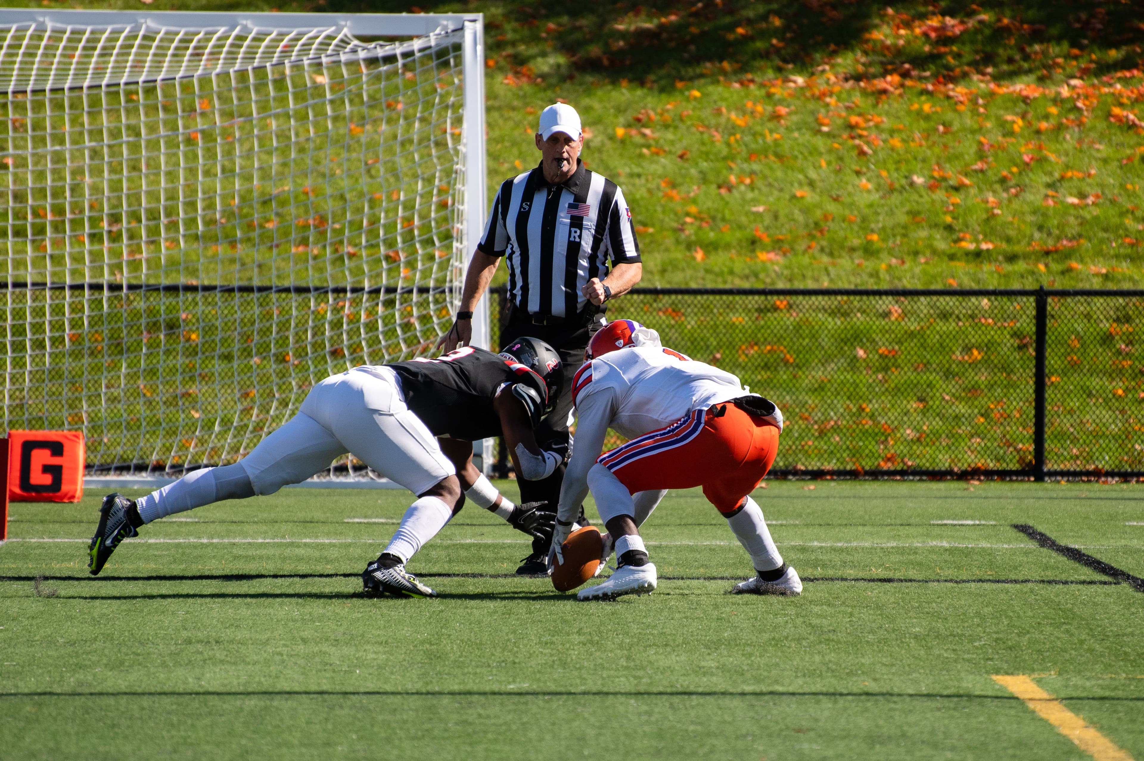 The game was a defensive stalemate for the entire first half as the fans witnessed a combined 10 punts. Engineer Jimmy Leblo picked off Hobart quarterback David Krewson in the first quarter, but the struggling RPI offense turned the ball over twice while nearing the red zone. The defense, however, put the Engineers on the scoreboard with a minute remaining in the half. On first and 10 at the Hobart 16-yard line, the Statesmen lined up in the wildcat formation, with only running back Rayshawn Boswell in the backfield. An errant snap tumbled into the end zone, and Boswell was unable to grab the loose ball. Defensive back CJ Lyons plowed into the ball to prevent Boswell from recovering the fumble, knocking it out of the back of the end zone for a safety. The two teams headed into halftime with an unpredictable 2‒0 scoreline.