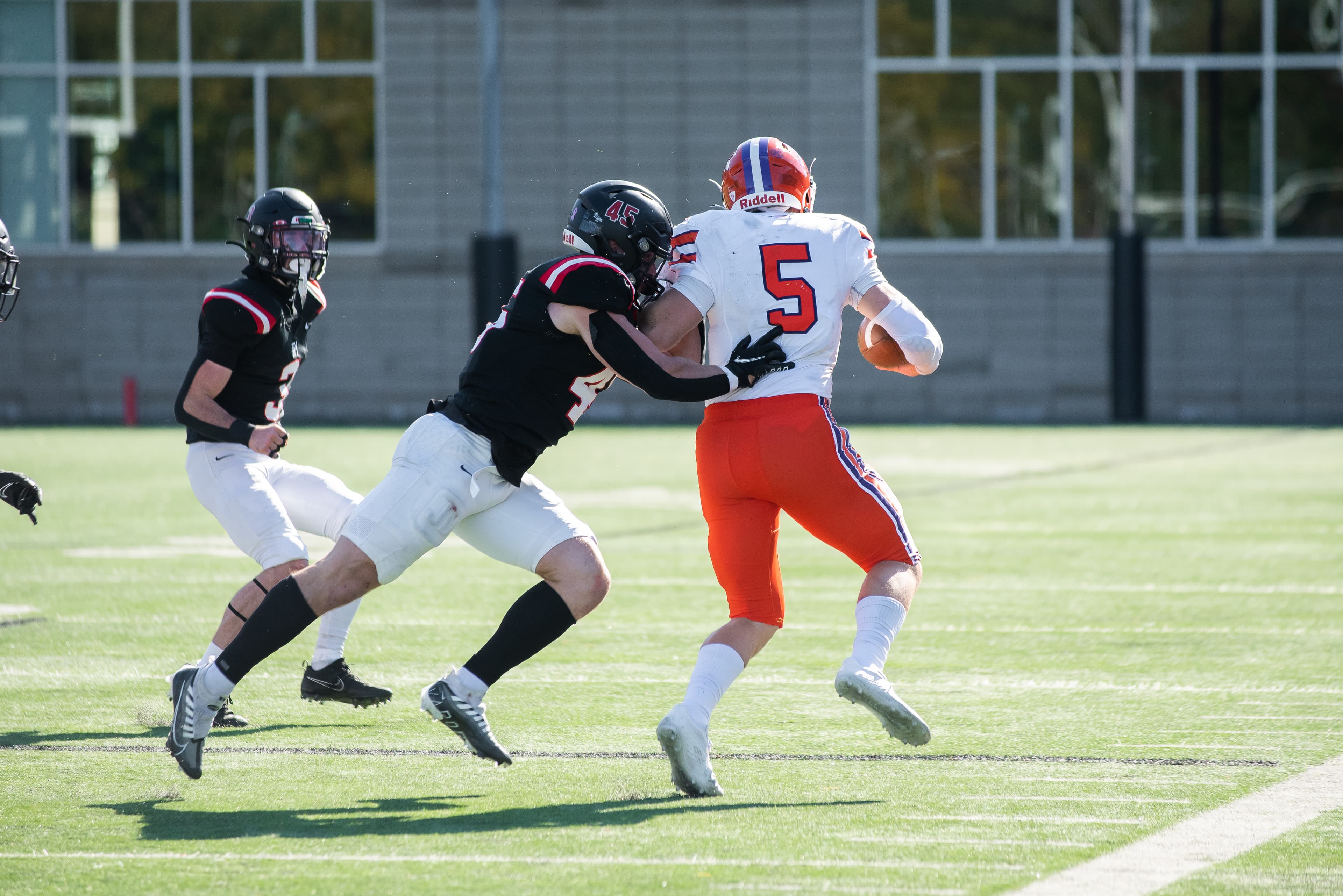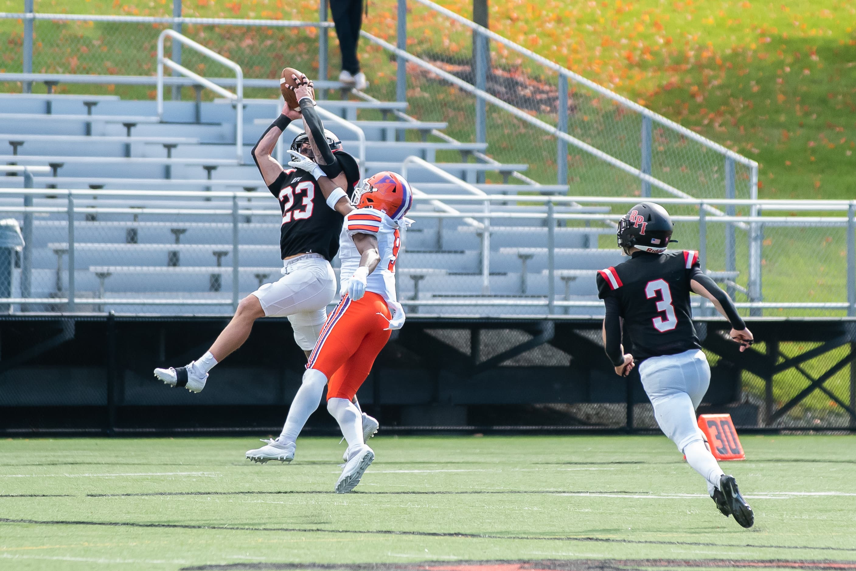 Quarterback Jake Kazanowsky connected with DJ Palmer for two fourth-quarter touchdowns to mount a staggering 14-point comeback, defeating the Hobart Statesmen 16‒13 to remain undefeated in the Liberty League. The Rensselaer defense continued their solid form as third in Division III in total defense and fifth in scoring defense, holding the visitors to 201 yards of total offense and forcing a safety.