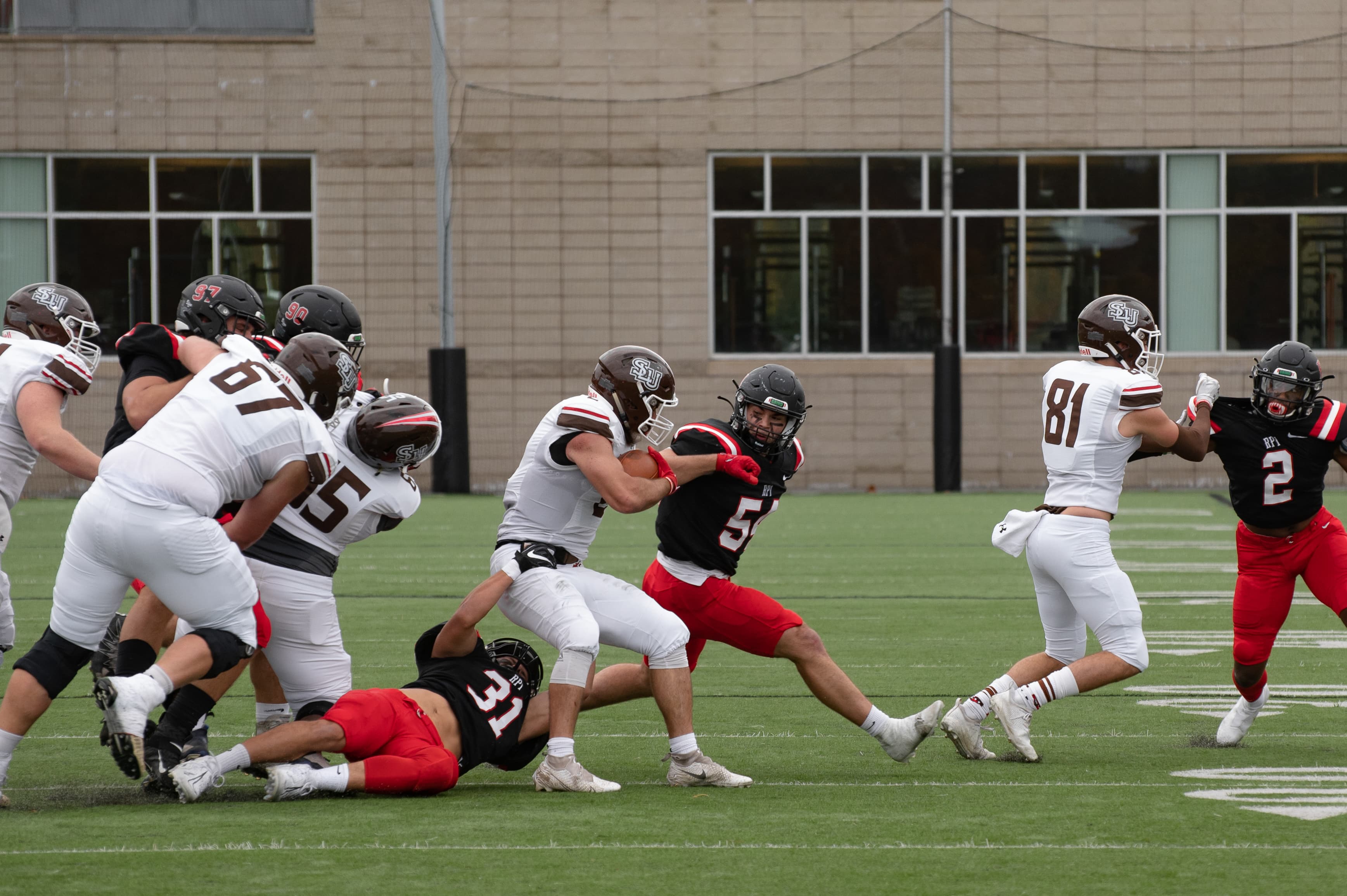Three punts on the next three drives returned possession to RPI at the St. Lawrence 46 with less than eight minutes remaining. On the only play of the Engineers’ drive, Burnett gained 18 yards before several Saints knocked the ball loose and recovered the fumble. The RPI defense continued to stuff the St. Lawrence offense, not giving up a first down for the rest of the game with Lyons crucially breaking up a pass on fourth down. The Engineers ran out the final minute on the clock, securing the 10‒6 victory.