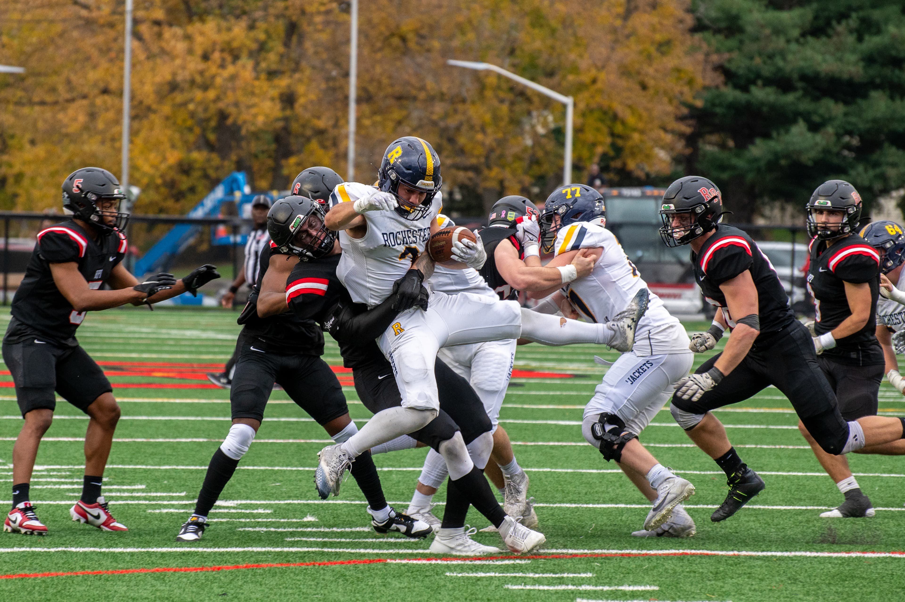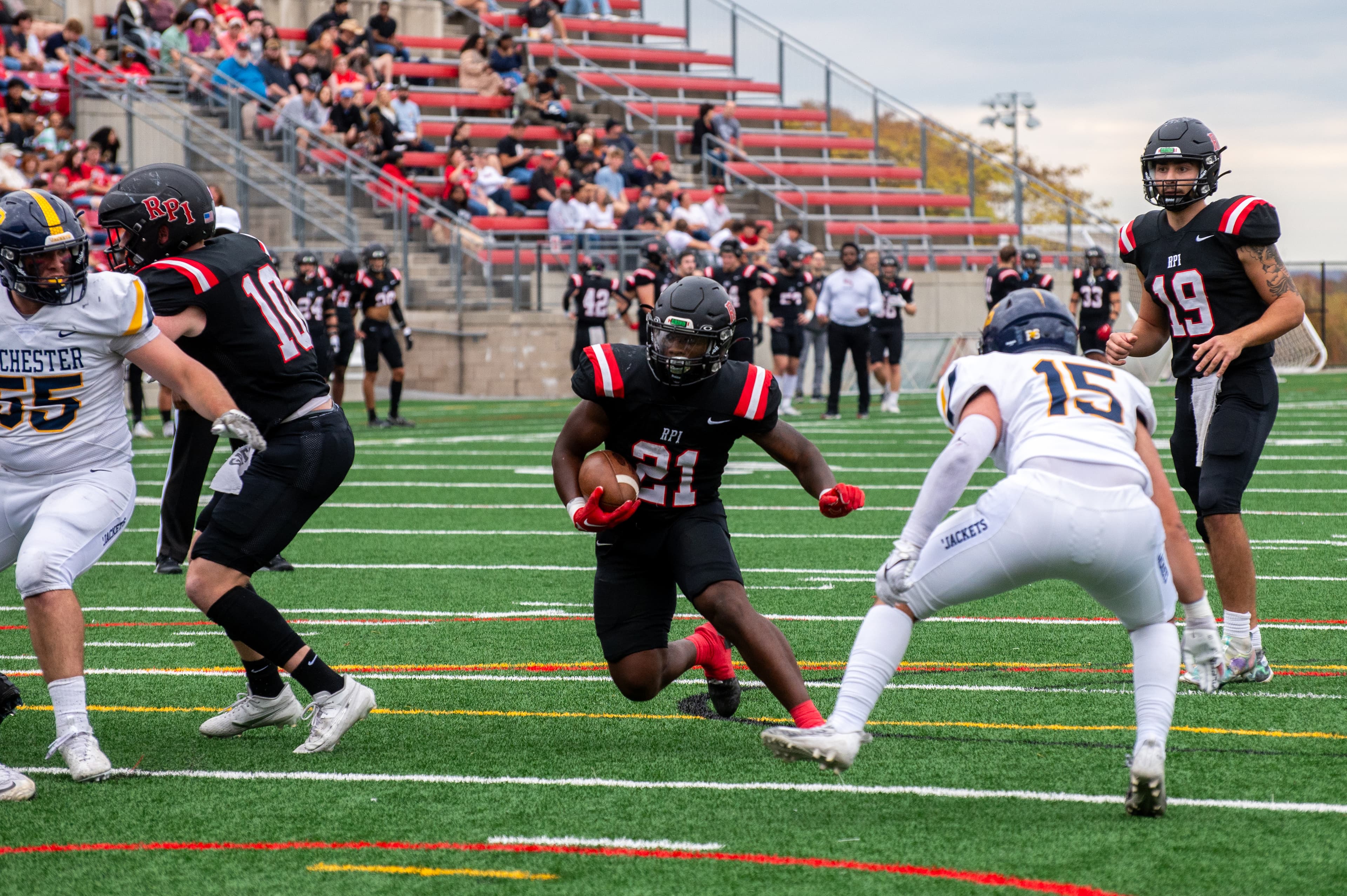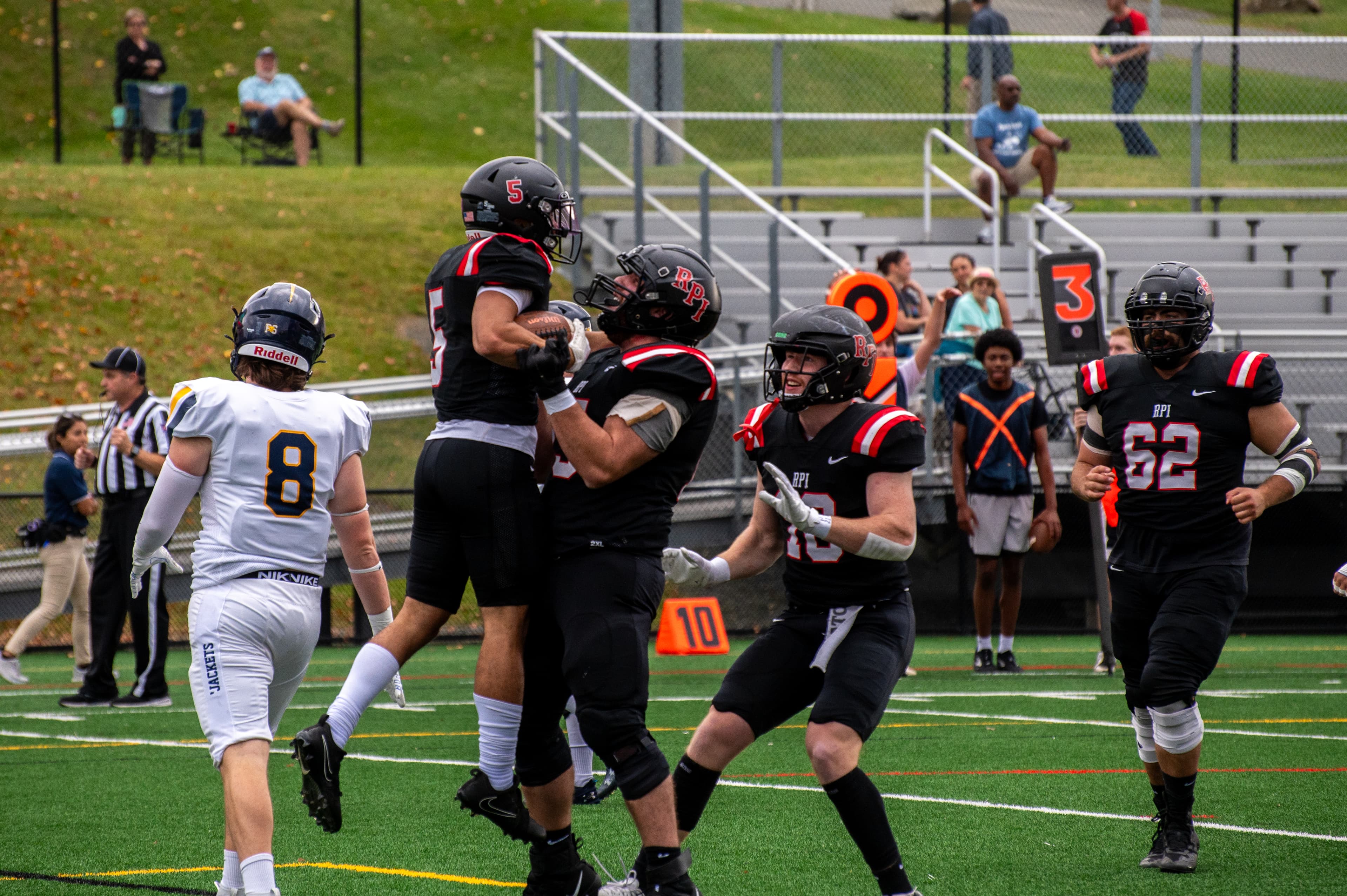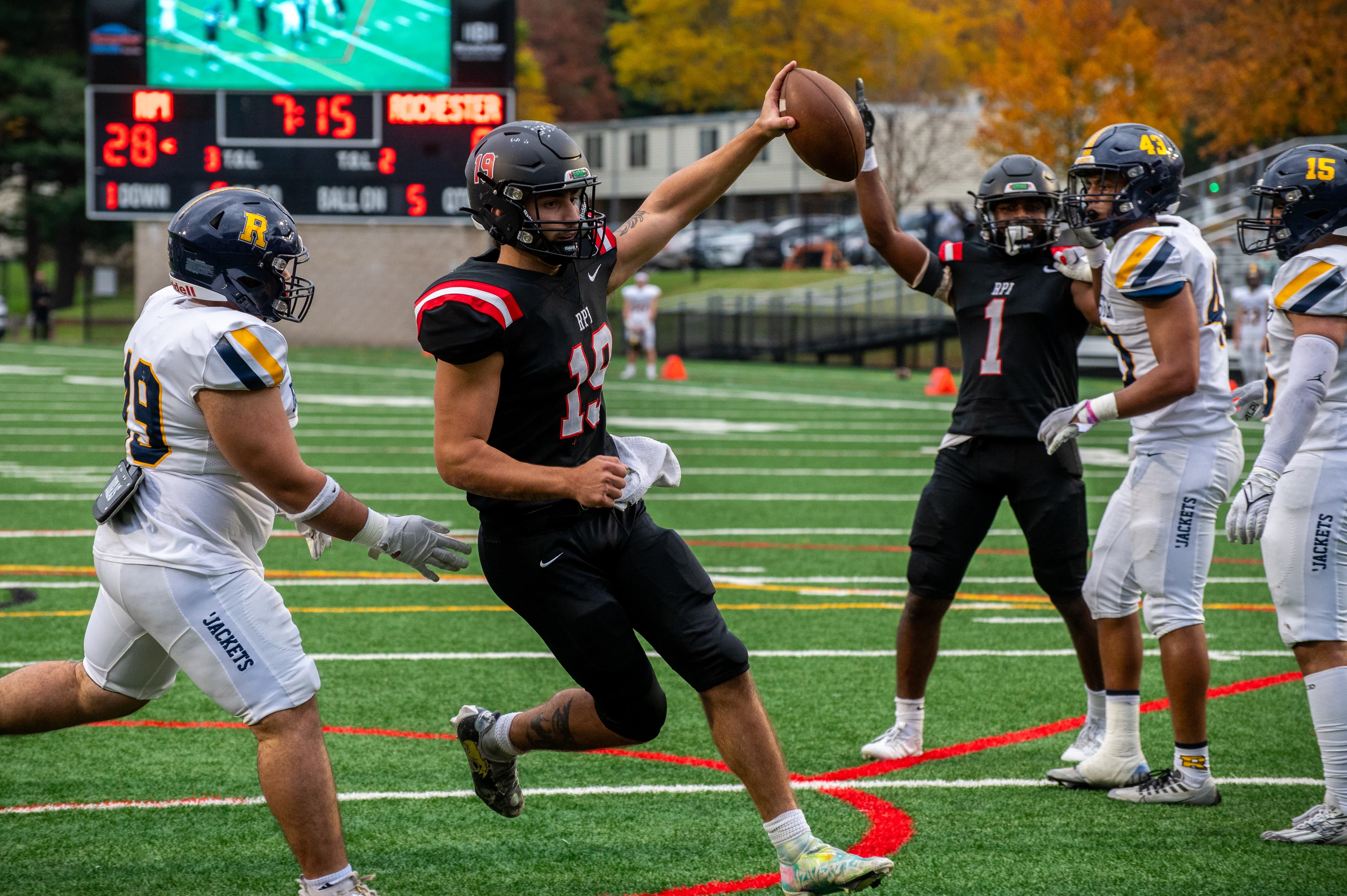 The Engineers defeated the University of Rochester Yellowjackets with a colossal 49‒10 win. The Engineers dominated the first quarter, scoring the first touchdown by coasting through the middle of the Yellowjackets defense two minutes in. Soon after, RPI linebacker Anthony D'Agostino intercepted with a 35‒yard pick‒six. The first quarter ended with a 21‒0 lead for the Engineers.