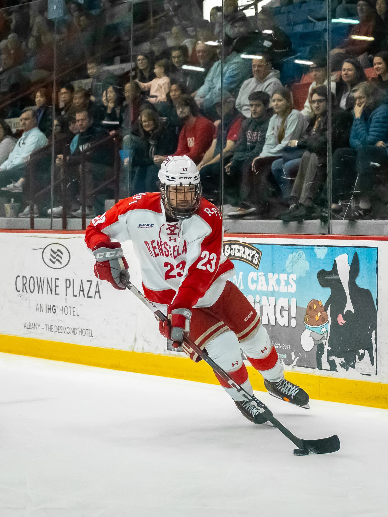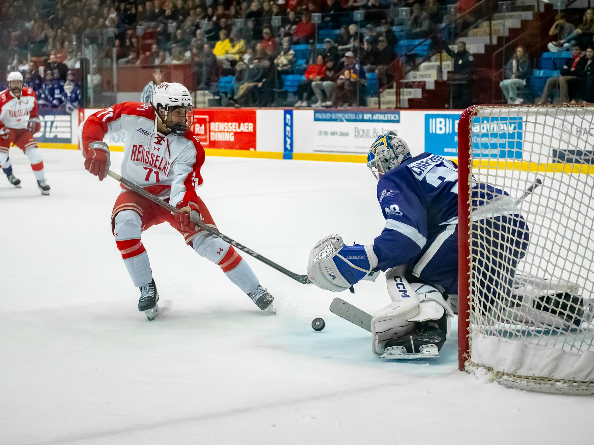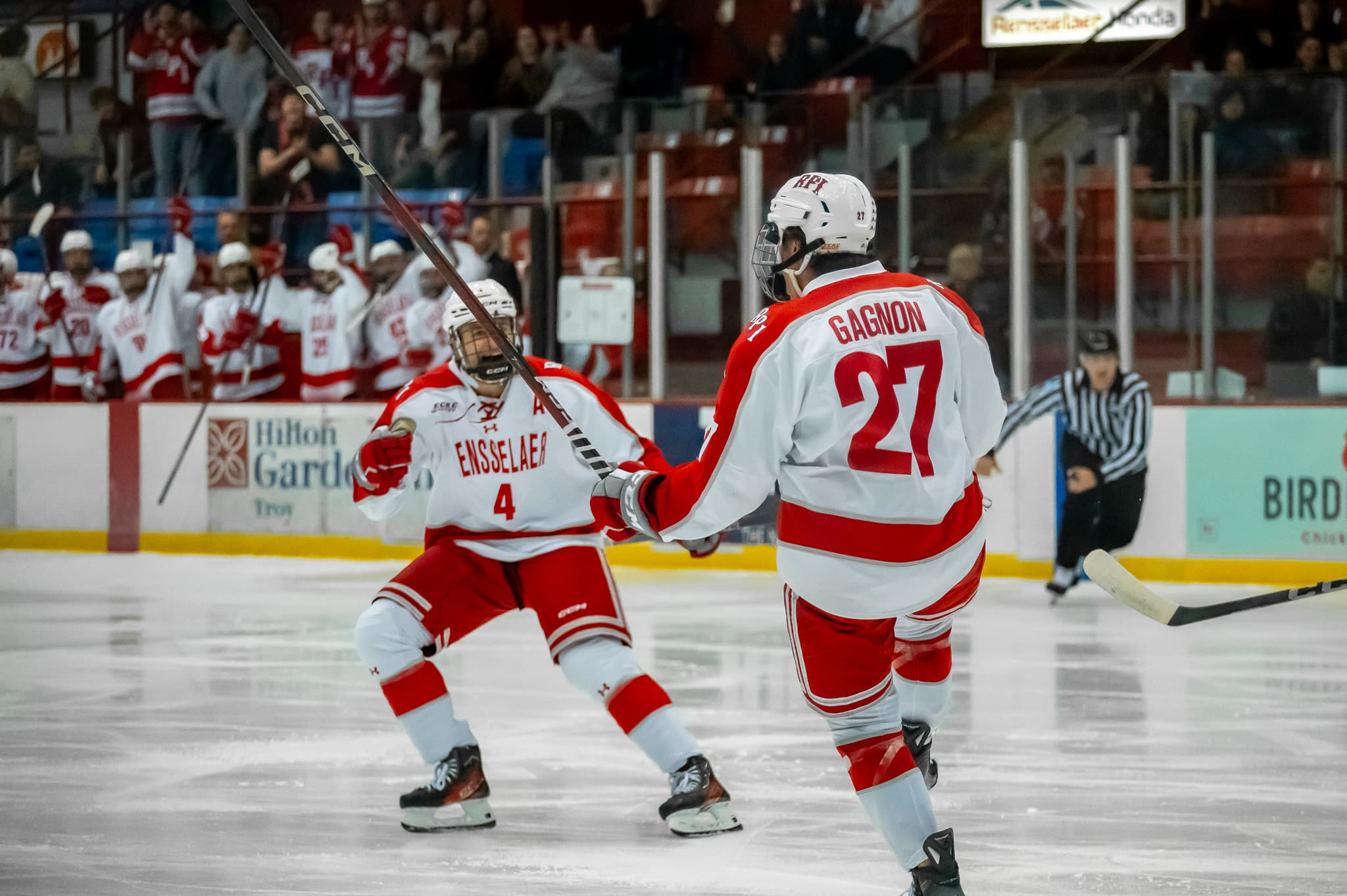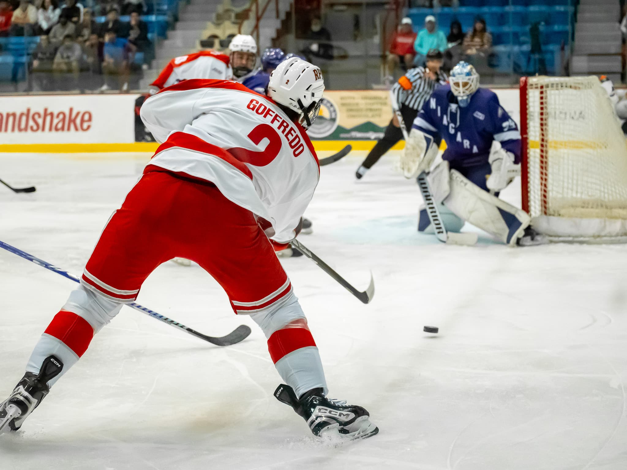 The first game of the double-header started off with a goal from Engineer Jake Gagnon just twenty seconds in, maneuvering the puck down the ice to sneak in a shot at the net. The Rensselaer offense would continue to pressure the Niagara goalkeeper throughout the first period, taking 14 more shots on net. Both Niagara and Rensselaer received penalties during this period, but neither team was able to score on a power play.