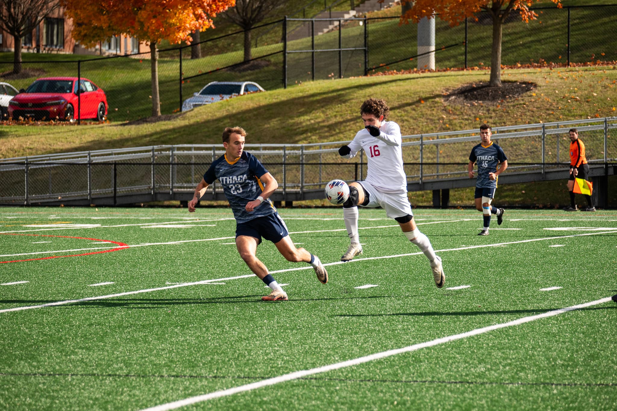 Even so, the Engineers retained a commanding possession of the ball in the first half, resulting in a goal at the twenty-two minute mark. A long pass from Benjamin Dionisio went deep into the Ithaca goalie box, allowing Landon Bradley to head the ball past the Bombers goalkeeper and bring the Engineers up to a 1-0 lead. This goal marked Bradley’s first and only for the season. Ithaca responded with eight more shots on goal in the first half, resulting in one save for Engineer goalkeeper Noah Churchill.