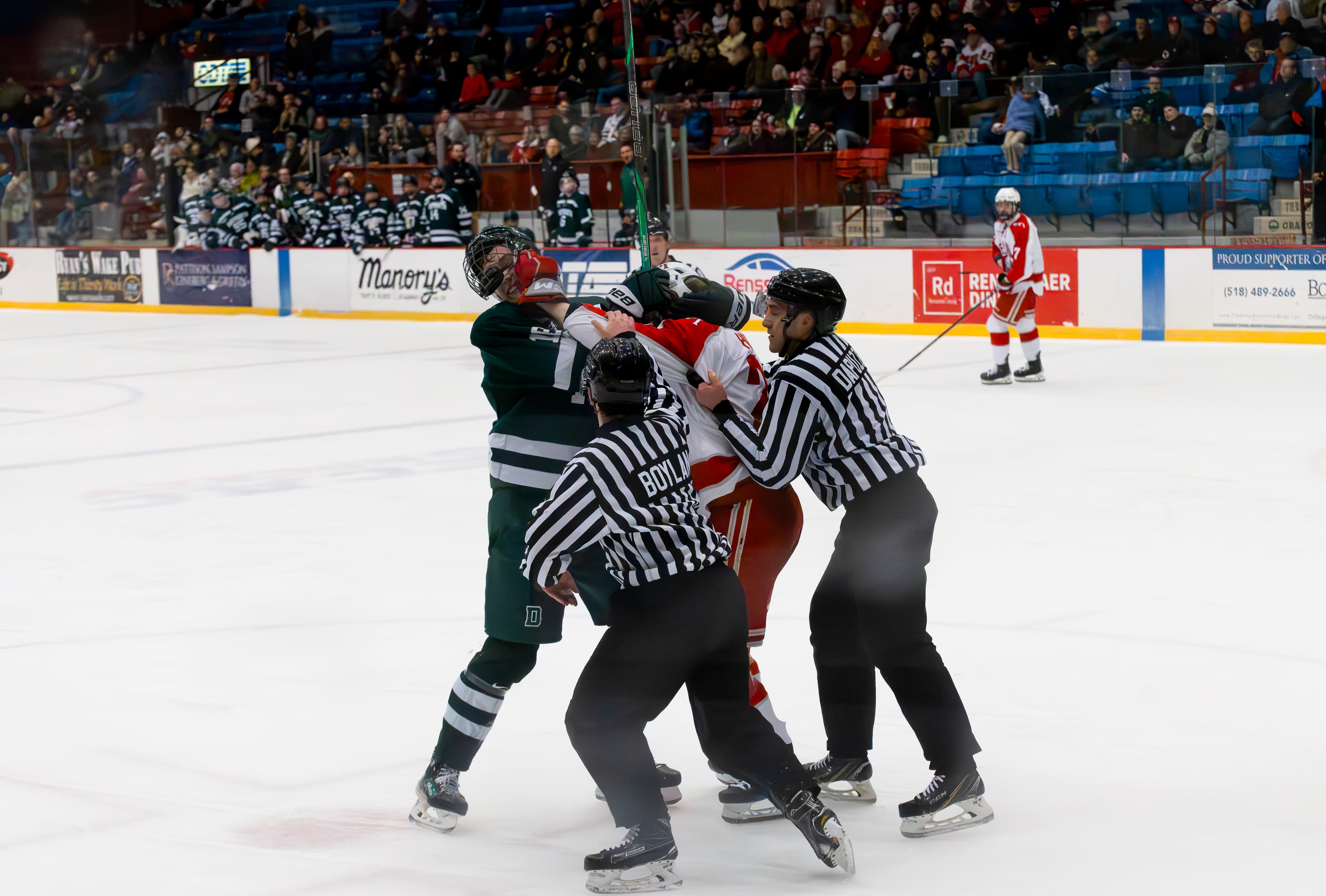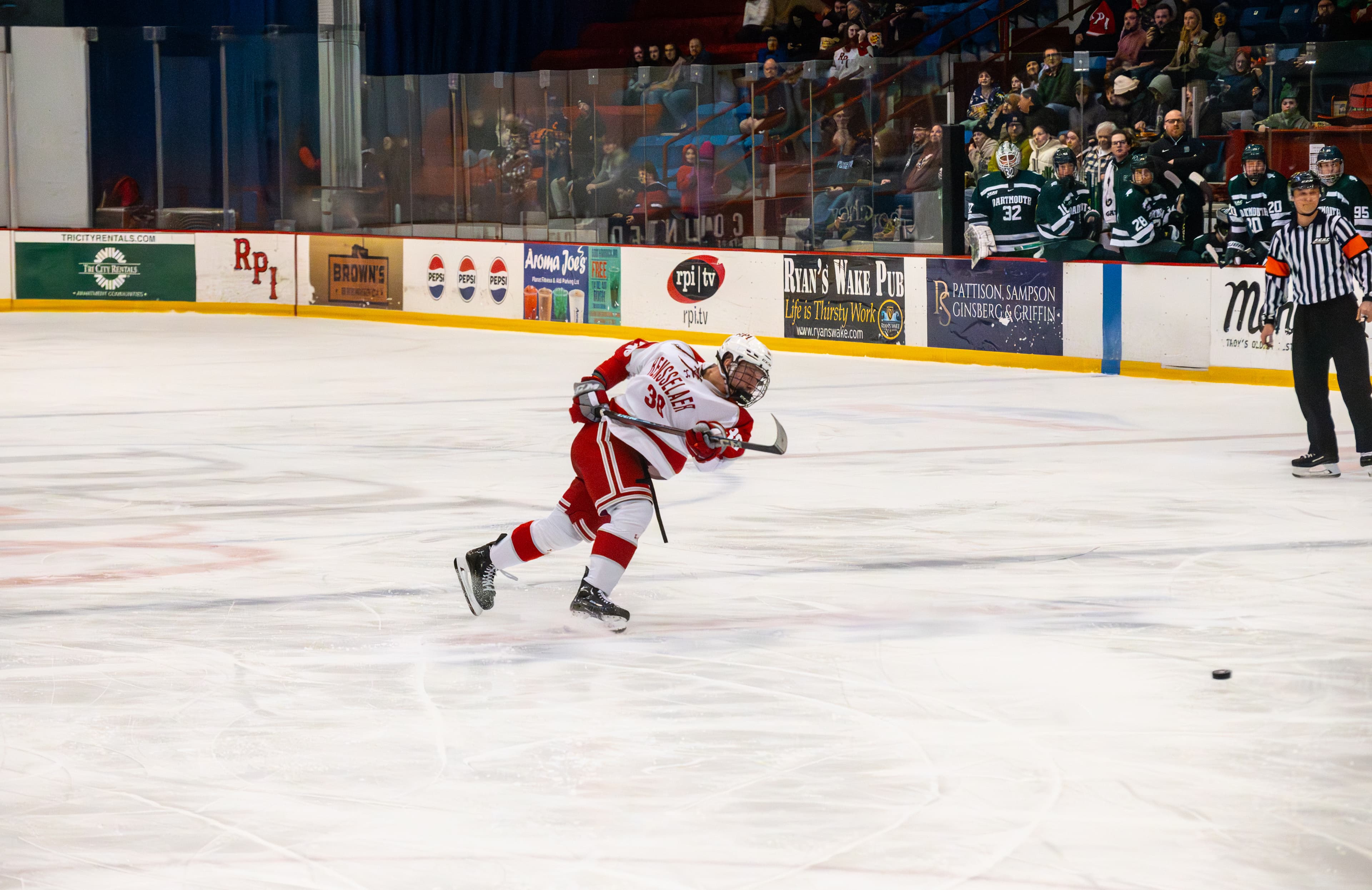 The second period began with more of the same; the Engineers consistently stuck defending their own goal. Even when the first Dartmouth penalty occurred midway through the period, RPI still could not capitalize on even attempting a shot at the goal even after Dartmouth’s first penalty midway through the first period. The game seemed to have really gotten out of hand when Dartmouth scored yet another goal and pushed the deficit to 0-3. However, this seemed to breathe some life into the Engineers; they immediately got on the board with a score by Max Smolinski, and three minutes later, Jeremie Payant drove it through making just a one score game. However, a minute later Dartmouth responded with another goal, keeping the game just out of reach for the Engineers as they headed into the third period with a 2-4 deficit.