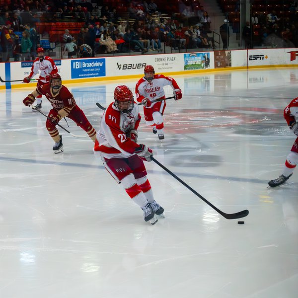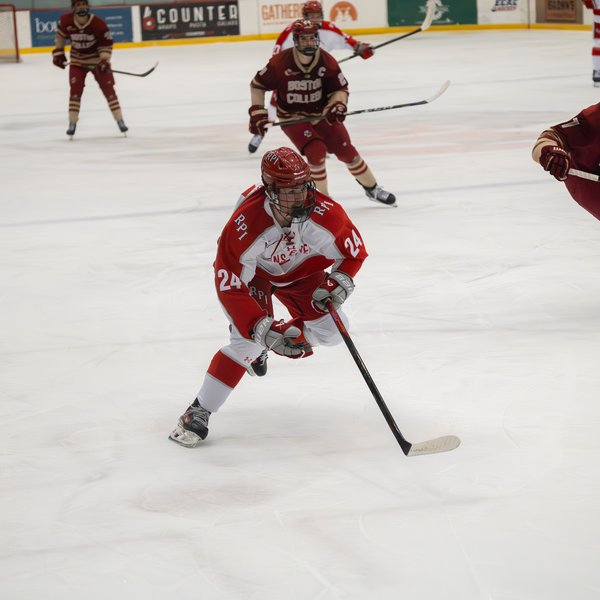 From the puck drop the Eagles put the pressure on Rensselaer’s defense, forcing a quick-pass game that kept Rensselaer chasing the puck up and down the ice. Engineer goalkeeper Bruno Bruveris held down his end of the ice, making 15 saves over the first period off of 16 shots on goal. The single Boston point, scored by Hagens, came immediately off of a power-play before the fifth Rensselaer skater made it back to the action. Four minutes later, Engineer forward Tyler Wallace responded with a power-play goal up close to even the score to 1-1.